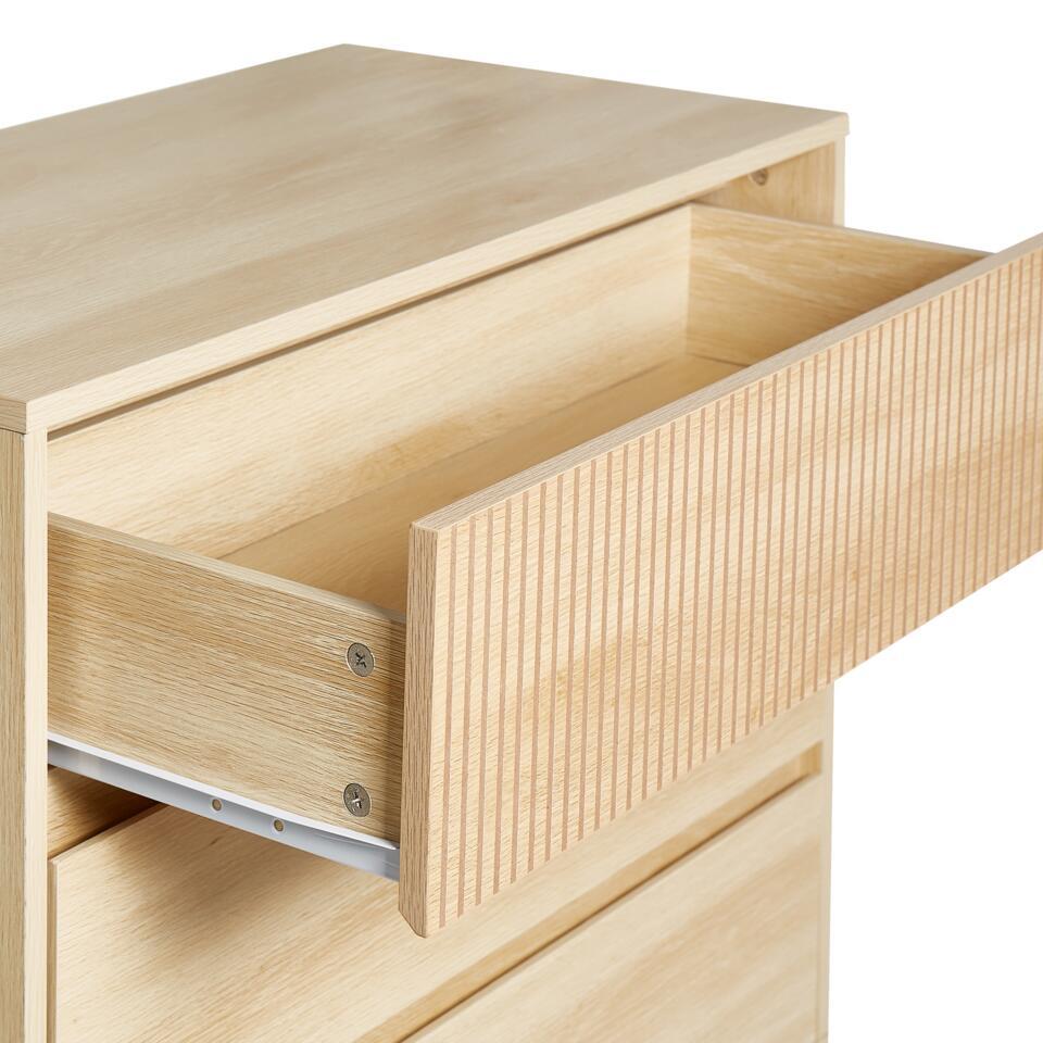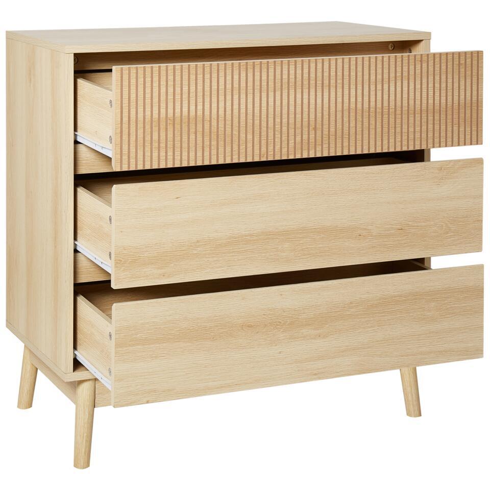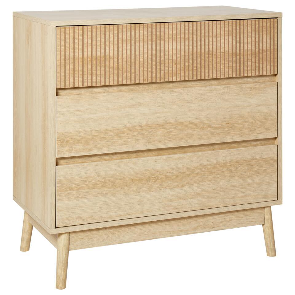 Woonkamer sideboard met lades. Deze commode met drie lades brengt warmte en eenvoud in elke kamer met zijn lichte houten afwerking en minimalistische ontwerp. De bovenste lade heeft een kenmerkende geribbelde voorkant, die een subtiel decoratief accent toevoegt aan de strakke lijnen. Deze kast wordt ondersteund door massief houten poten en is zowel stabiel als duurzaam, ideaal voor het opbergen van kleding, linnengoed of persoonlijke spullen. Deze kast is stijlvol en sober en combineert functionaliteit met een elegant ontwerp.