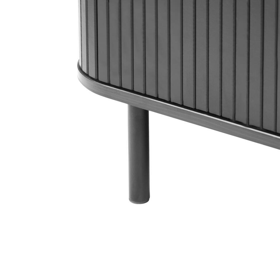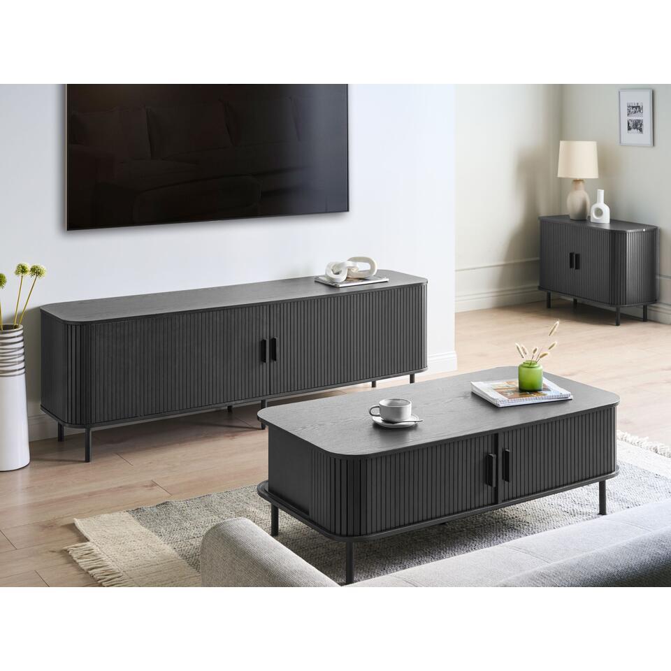 Retro TV-kast met schuifdeur voor tv's tot 54''. Richt je kamer in met deze TV-standaard en organiseer de kamer dankzij het ontwerp. Dit chique meubel heeft twee slanke schuifdeuren met daarachter vier ruime planken die voldoende opbergruimte bieden voor je boeken, tv-accessoires en andere benodigdheden, zodat je een rommelvrije ruimte hebt. Uitgerust met vier kabelgaten houdt het moeiteloos al je kabels netjes geordend en uit het zicht. Het retro design van het meubel, gecombineerd met de zwarte tint en zwarte poten, zorgen ervoor dat het opvalt en past bij verschillende interieurstijlen. De hoogwaardige materialen die voor de constructie zijn gebruikt, garanderen niet alleen eenvoudig onderhoud, maar ook duurzaamheid, waardoor het een praktische en stijlvolle toevoeging aan je interieur is.