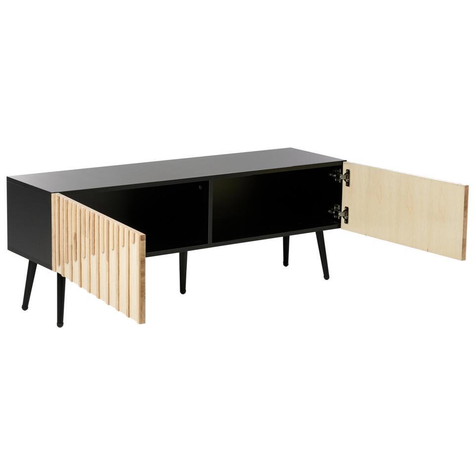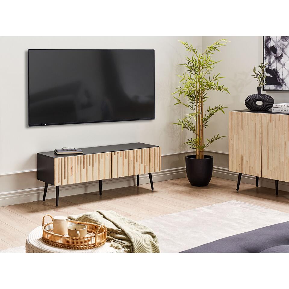 Kast voor een tv in moderne stijl met ruime opbergruimte. Dit chique TV-meubel combineert een strak MDF frame met een melamine fineer afwerking en massief houten deuren voor een vleugje natuurlijke elegantie. De ijzeren poten voegen een modern randje toe, terwijl de strakke lijnen en het minimale ontwerp maken dat het perfect past in elke moderne slaapkamer. De praktische opbergruimte en het stijlvolle ontwerp passen in elk modern huis.
