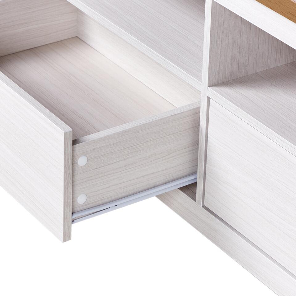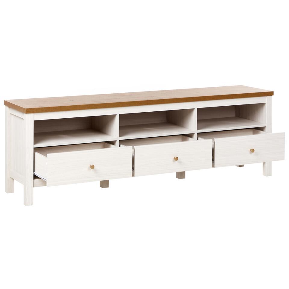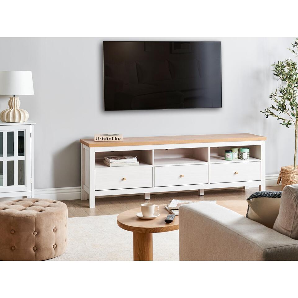Stijlvolle tv-kast met lades. Dit stijlvolle Tv-meubel is een perfect meubelstuk voor elke woonkamer. Met 3 lades biedt het extra opbergruimte voor kleine spullen. Het meubel is gemaakt van licht en duurzaam materiaal en wordt ondersteund door stevige poten die voor stabiliteit zorgen. De neutrale witte kleur en het warmgetinte bovenblad passen goed bij verschillende interieurstijlen.