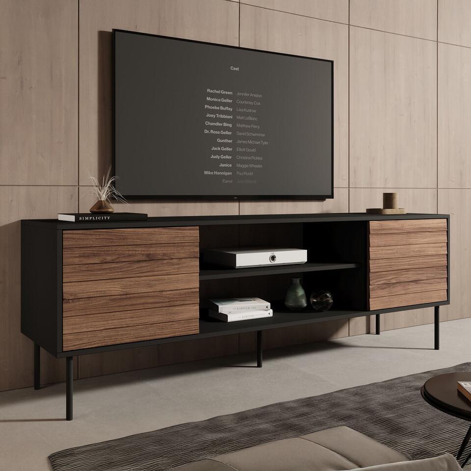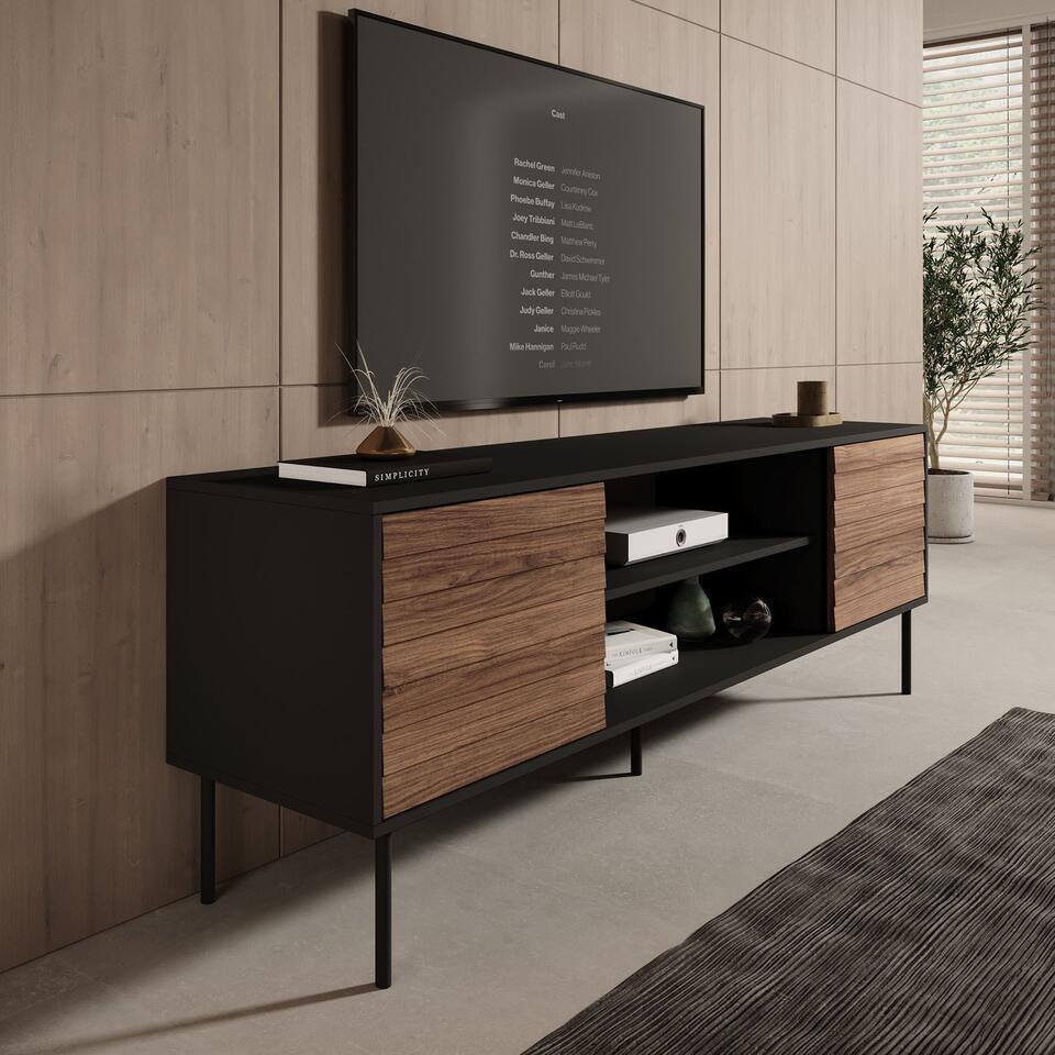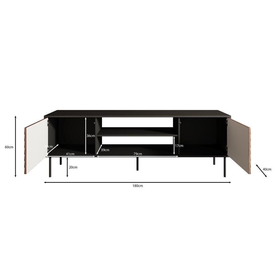 TV-Meubel Cordoba is gemaakt in eiken met zwarte kleur en staat op metalen poten. De TV-kast beschikt over 2 deuren waarachter in totaal 2 opbergvakken zitten. De deuren openen met het push to open systeem. Ook heeft het meubel nog 2 open vakken. Het meubel wordt ongemonteerd geleverd. Je dient het dus met behulp van de bijgeleverde handleiding zelf in elkaar te zetten.