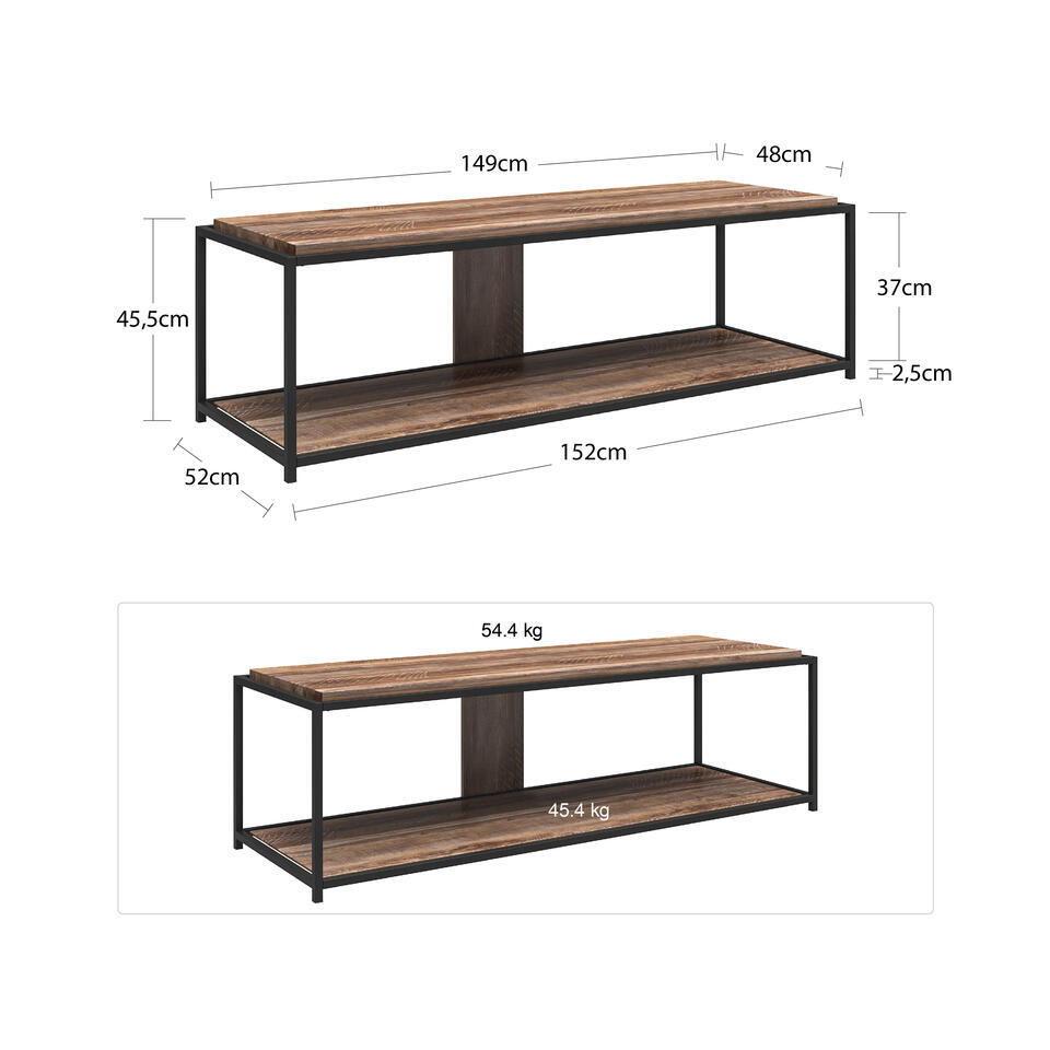 Verfraai je woonkamer met het moderne tv meubel, geschikt voor TV's tot 65" breed of 54 kg. Gemaakt van gelamineerd gefabriceerd hout met een stevig metalen frame, heeft dit tv meubel een verweerde houtnerfafwerking, waardoor het een opvallend pronkstuk is voor je woonkamer. Het open ontwerp vergemakkelijkt de installatie van apparaten en zorgt voor een goede luchtcirculatie voor je apparatuur.
