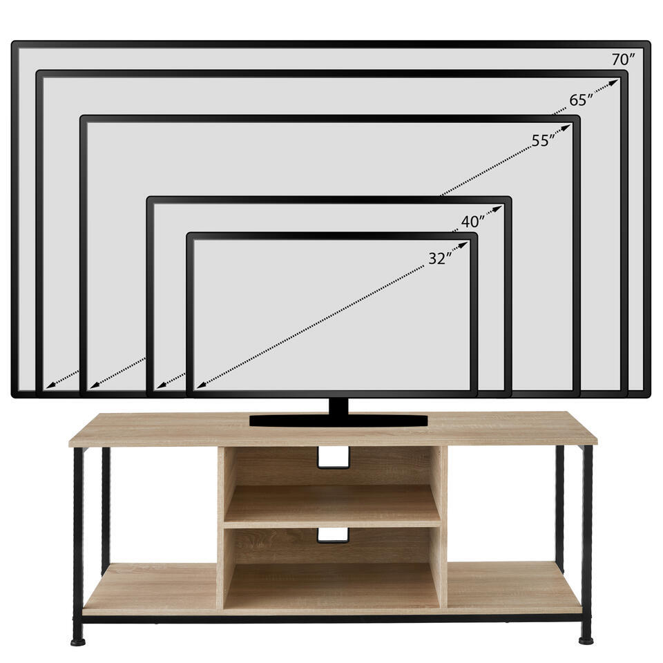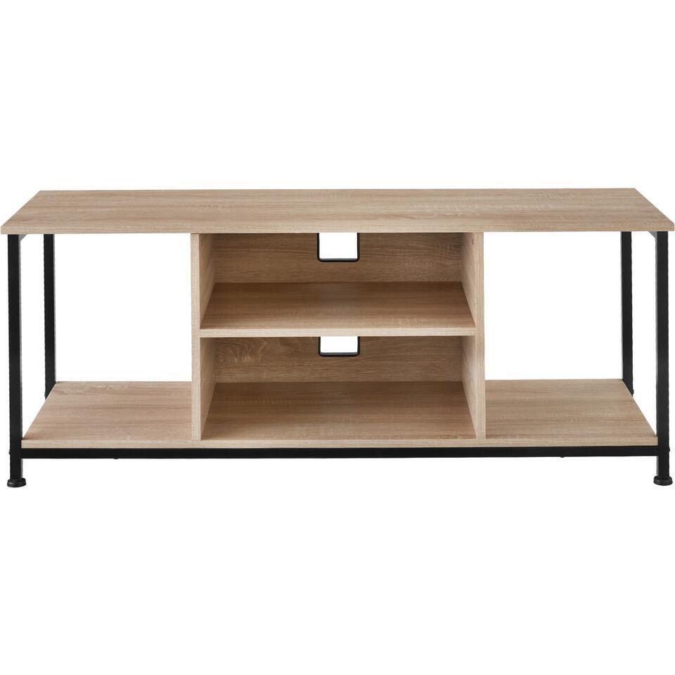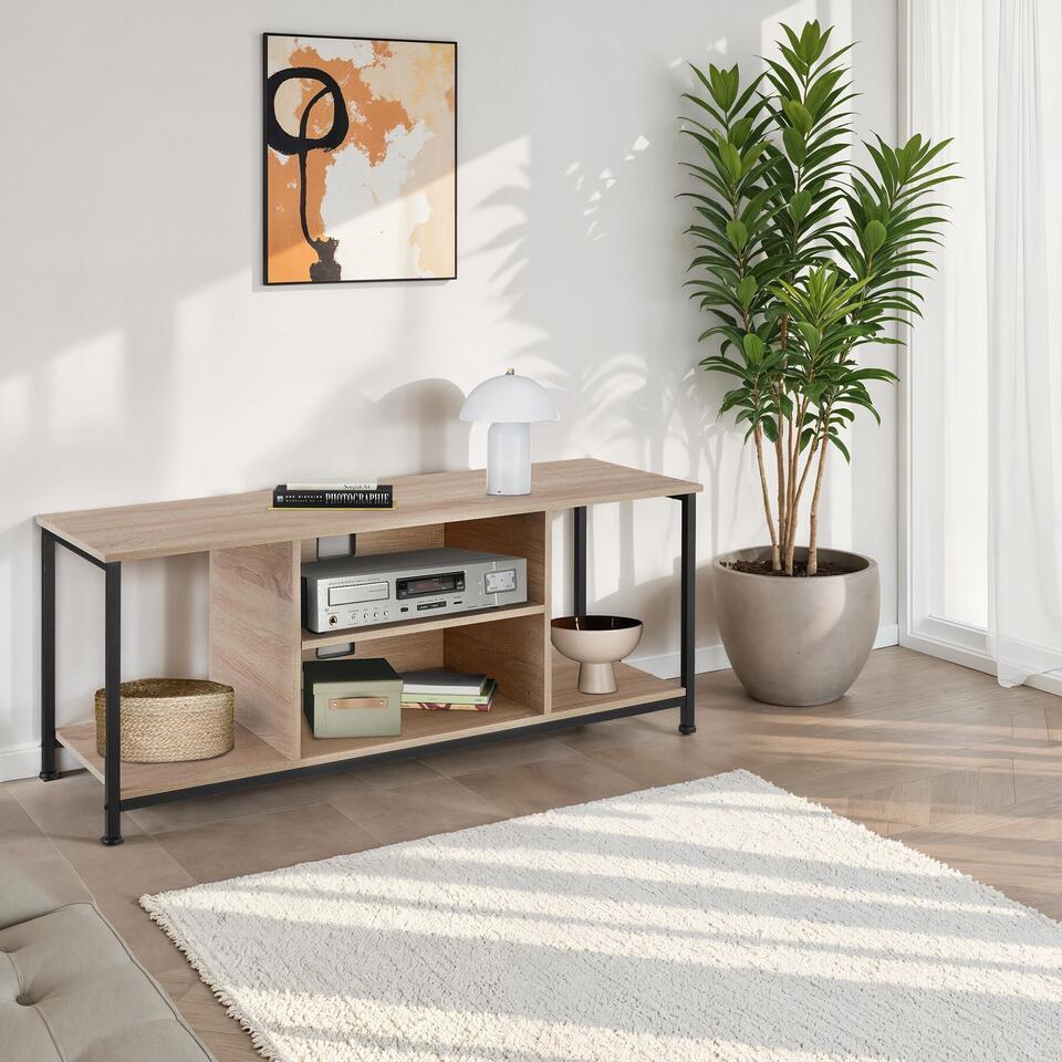 Het hoekige uiterlijk en het kleurcontrast tussen de warme houten oppervlakken en het koele metalen frame zijn de kenmerken van dit functionele tv-meubel met een typische industriële look. Vier open vakken bieden veel opbergruimte, waarbij de plank in het midden in drie verschillende hoogtes verstelbaar is. Dit tv-meubel heeft twee vierkante uitsparingen in de achterwand, dit zorgt voor een overzichtelijke kabelgeleiding. De beschermende melaminecoating, de goede veerkracht en de in hoogte verstelbare poten bieden vele voordelen in het dagelijks gebruik en dragen bij aan de lange levensduur van het stijlvolle tv-meubel.
