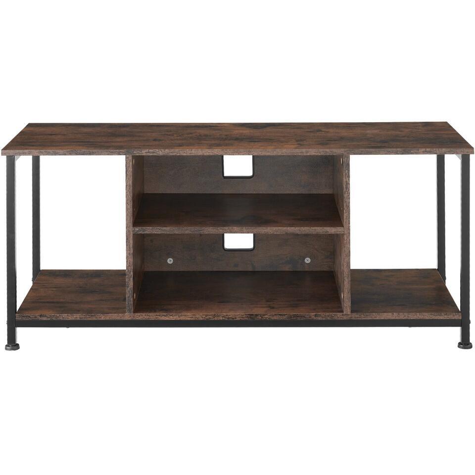 Het hoekige uiterlijk en het kleurcontrast tussen de warme houten oppervlakken en het koele metalen frame zijn de kenmerken van dit functionele tv-meubel met een typische industriële look. Vier open vakken bieden veel opbergruimte, waarbij de plank in het midden in drie verschillende hoogtes verstelbaar is. Dit tv-meubel heeft twee vierkante uitsparingen in de achterwand, dit zorgt voor een overzichtelijke kabelgeleiding. De beschermende melaminecoating, de goede veerkracht en de in hoogte verstelbare poten bieden vele voordelen in het dagelijks gebruik en dragen bij aan de lange levensduur van het stijlvolle tv-meubel.