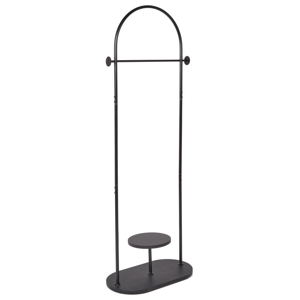 IJzeren kledingrek. Dit strakke metalen kledingrek combineert stijl en functionaliteit, perfect voor moderne huizen of kantoren. Met een stevige rail voor jassen en jacks en een handige onderste plank voor tassen of schoenen brengt het een vleugje industriële charme naar elke gang of werkruimte. Het minimalistische ontwerp biedt praktische opslag zonder afbreuk te doen aan de uitstraling, waardoor het een ideale aanvulling is om je ruimte georganiseerd en rommelvrij te houden.