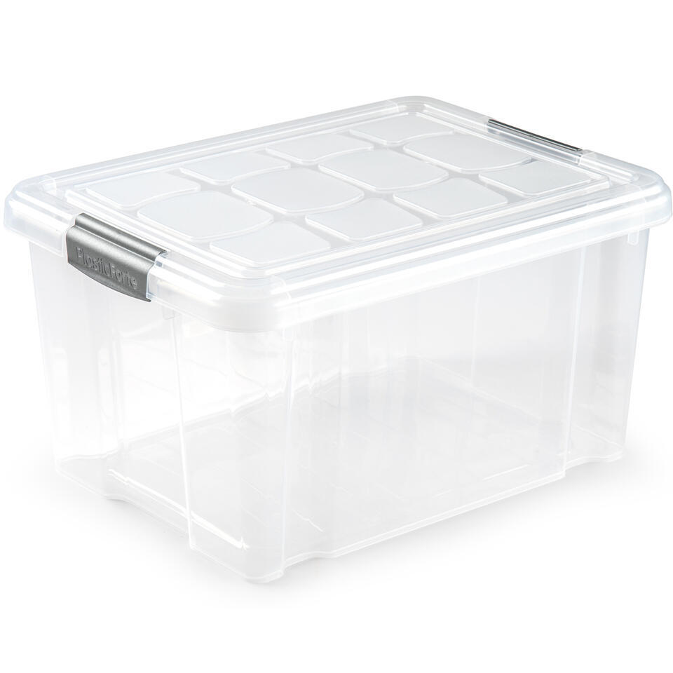 Opslagbakken/organizers van stevig kunststof met deksel. Transparante opbergbakken met deksel welke is voorzien van grijze sluitclips. Handig voor het opbergen van spullen. Inhoud: ca. 25 liter. Formaat: 42 x 36 x 25 cm. Materiaal: kunststof (plastic).