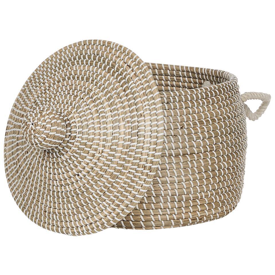 Handgeweven mand met deksel en handvaten. Ontdek het toppunt van stijlvolle organisatie met deze unieke mand. Hij is gemaakt in een natuurlijke tint en combineert functionaliteit met elegantie. De handvatten en deksel zorgen voor een gemakkelijke toegang en een verfijnde uitstraling. Verfraai je interieur met deze mand van zeegras, waar handigheid en natuurlijke elegantie perfect samengaan.