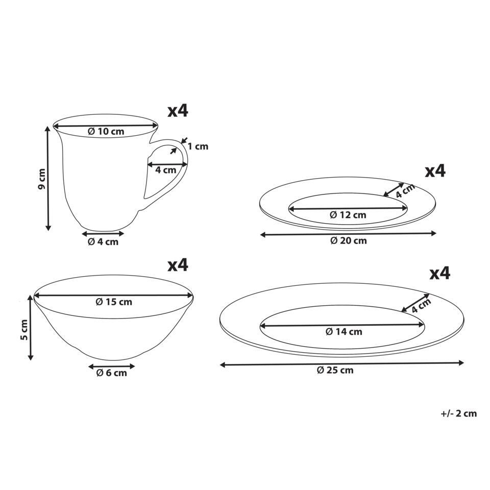 Aanbod omvat: 4 x Dinerbord, 4 x Dessertbord, 4 x Schaal, 4 x Mok
