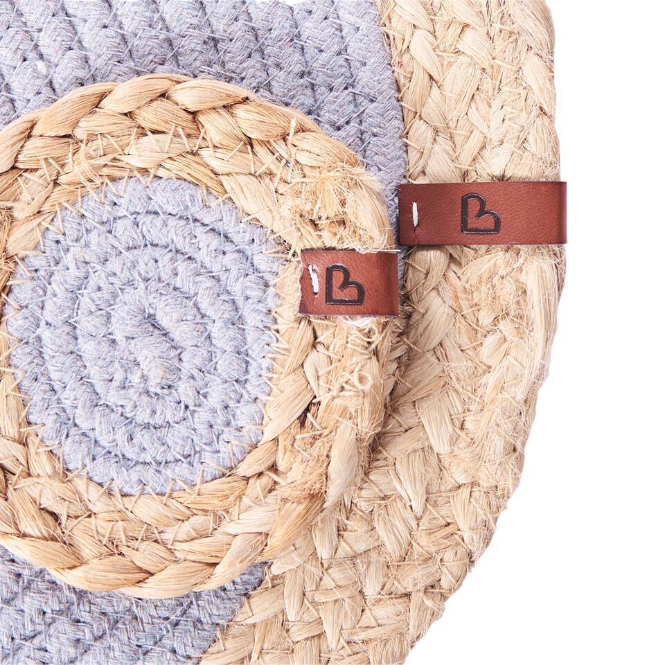 Set van ronde handgemaakte placemats en onderzetters. Geef je eetkamer een vleugje kleur en natuurlijke elegantie met deze prachtige set placemats en onderzetters. Ze zijn gemaakt van een mix van jute en katoen. De prachtige stof omringd door warme, aardse jute creëert een stijlvol contrast dat elke tafelsetting tot zijn recht laat komen. Deze met zorg handgeweven milieuvriendelijke stukken zijn zowel praktisch als mooi, beschermen je oppervlakken en geven je huis een unieke, chique uitstraling. Deze set is perfect voor elke gelegenheid en combineert modern design met duurzaam vakmanschap voor een geweldige eetervaring.