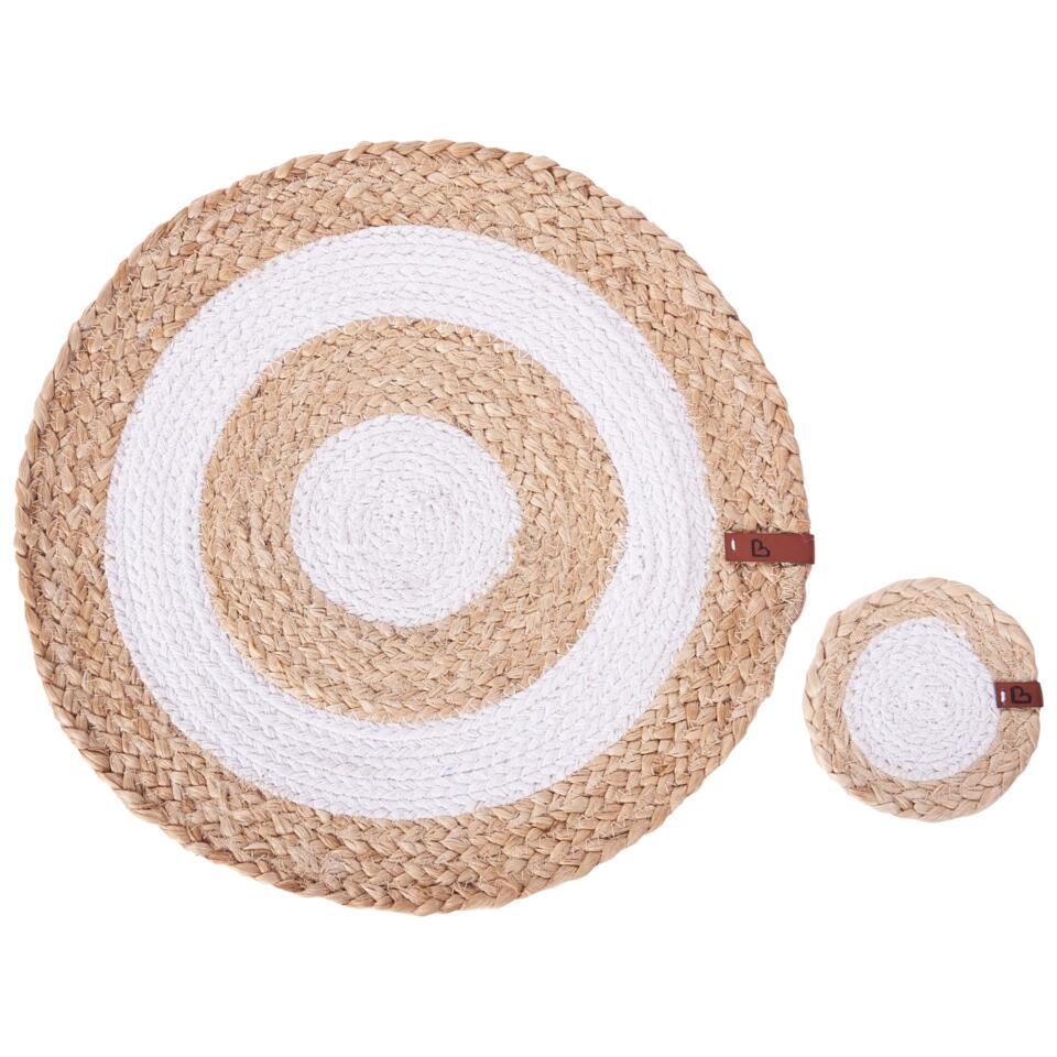 Set van ronde handgemaakte placemats en onderzetters. Geef je eettafel een stijlvolle, natuurlijke sfeer met deze prachtige set placemats en onderzetters, gemaakt met een combinatie van jute en katoen. Het unieke spiraalontwerp, met zachte natuurlijke tinten in een lichte tint, voegt een frisse, moderne sfeer toe aan elke tafelsetting. Deze milieuvriendelijke, handgemaakte stukken bieden zowel duurzaamheid als elegantie, perfect voor het beschermen van je oppervlakken en het opfleuren van je interieur. Of je nu een etentje geeft of geniet van een gewone maaltijd, deze set is een perfecte keuze voor elke gelegenheid.