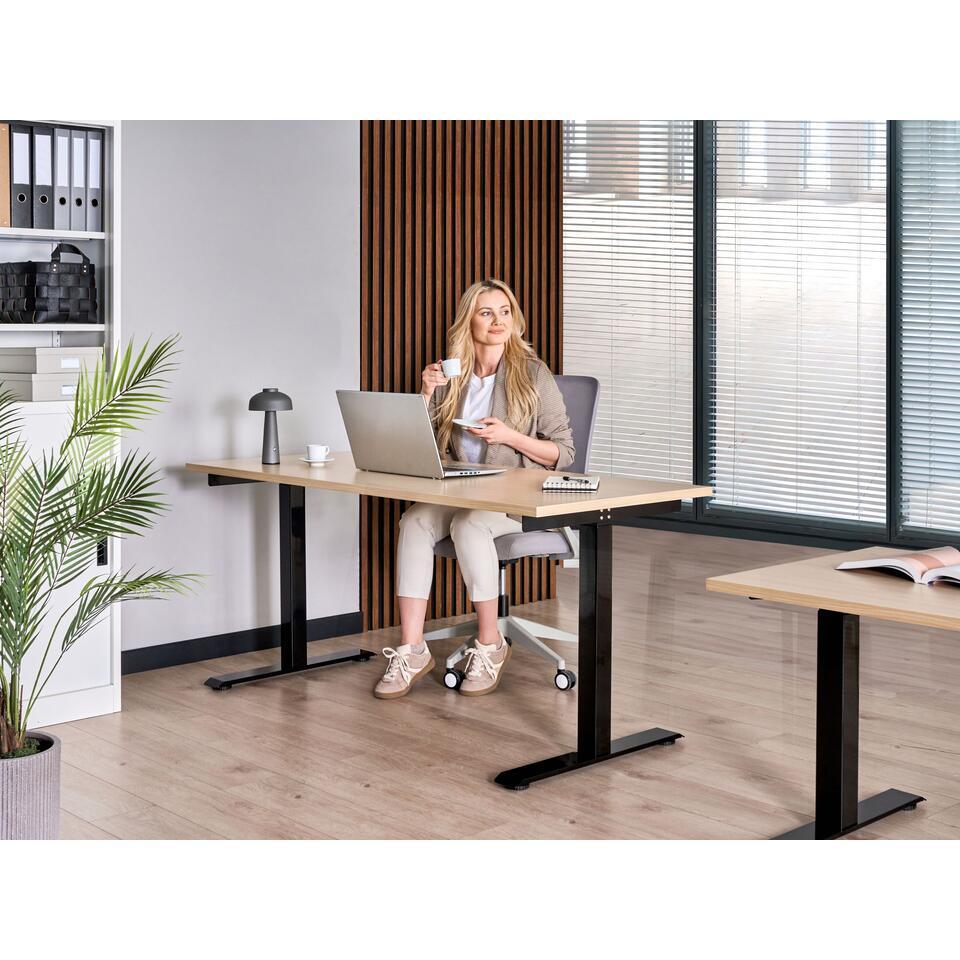 Zit-sta bureau met verstelbare hoogte. Dit bureau beschikt over elektrische hoogteverstelling met drie voorkeuze-instellingen, waardoor je soepel en stil kunt wisselen tussen zitten en staan. Hierdoor is het geschikt voor elke werkplek of studieruimte. Het bedieningspaneel heeft een ingebouwde USB-poort om je apparaten gemakkelijk op te laden. De brede poten en antibotsingssensor zorgen voor optimale stabiliteit en veiligheid tijdens het gebruik. Het melamine-gecoate tafelblad wordt ondersteund door een stevig stalen frame en staat garant voor duurzaamheid, een hoog draagvermogen en dagelijkse betrouwbaarheid.