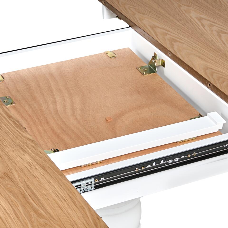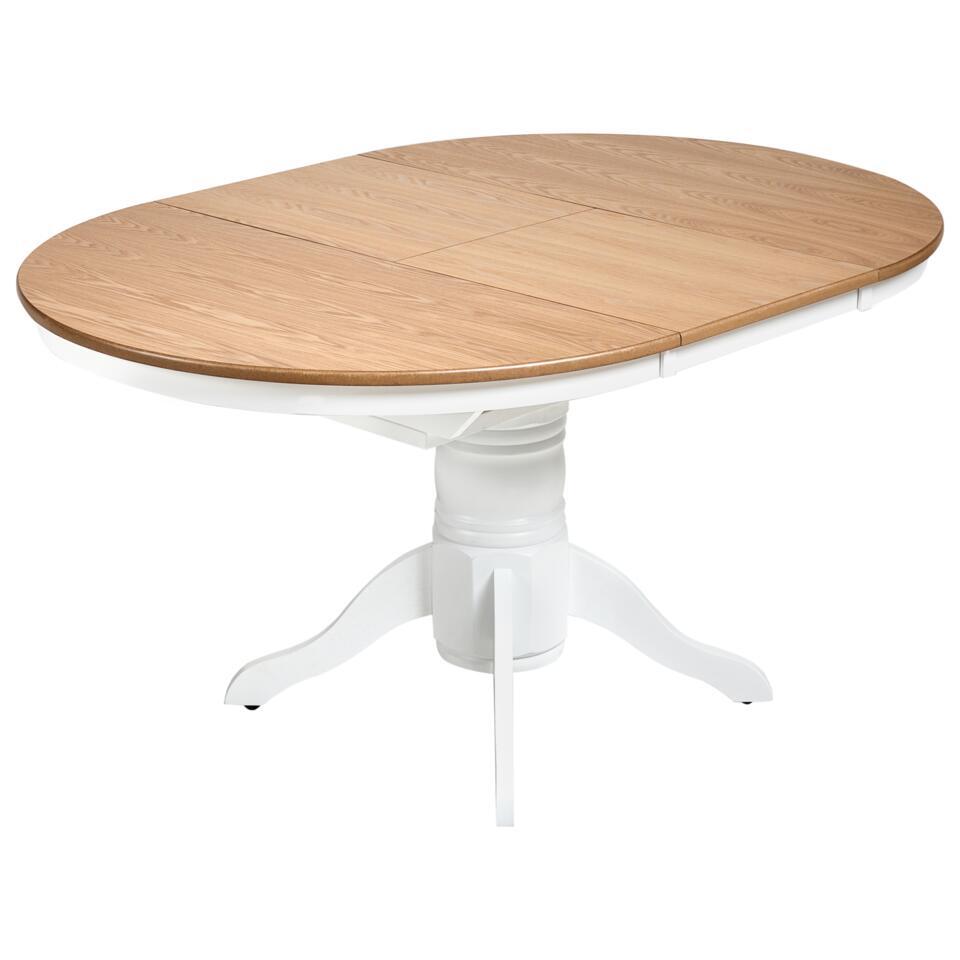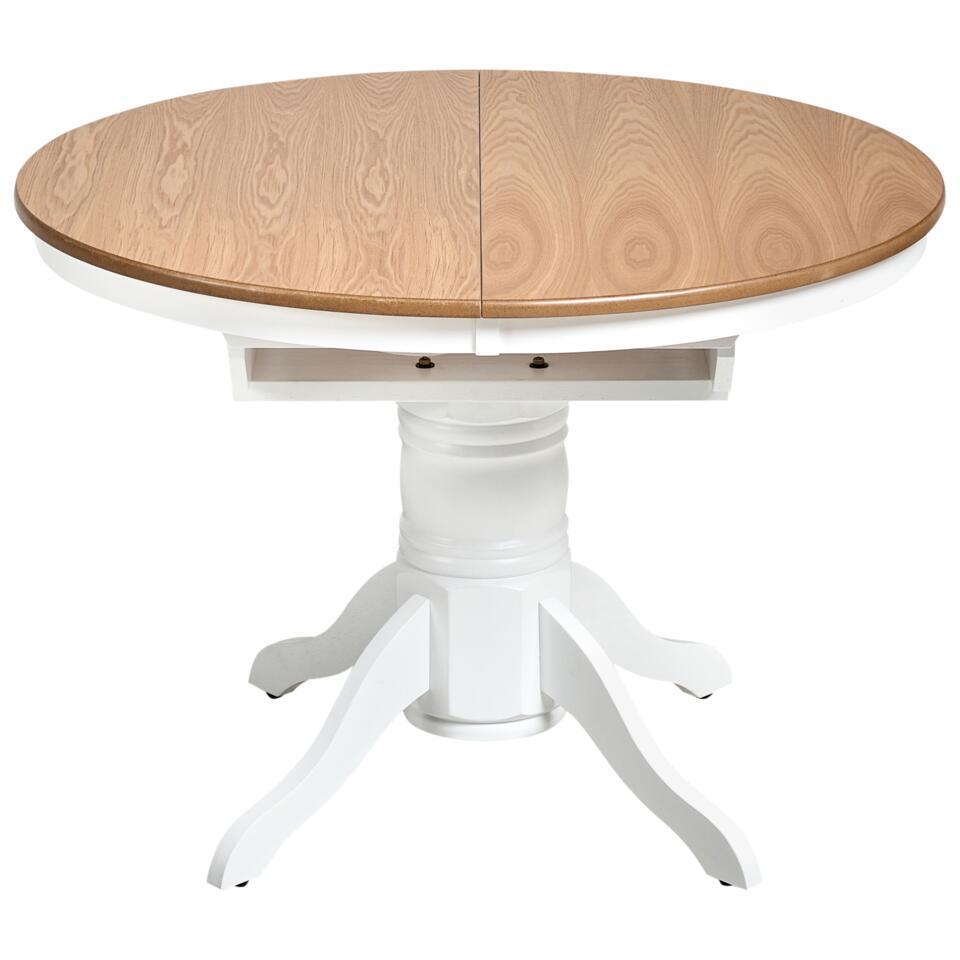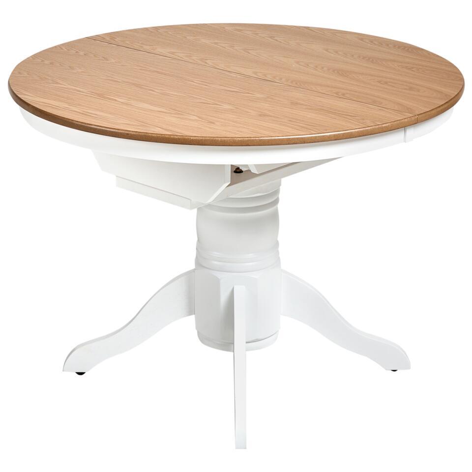 Eettafel in boerderijstijl. Breng een vleugje vintage charme naar je eethoek met deze prachtig vormgegeven tafel. Het retro-geïnspireerde voetstuk en de vier zacht gebogen poten, gemaakt van massief rubberhout in een witte afwerking, geven de tafel een lichte, uitnodigende uitstraling. Het ronde tafelblad, afgewerkt met bruin essenhoutfineer, heeft een vlindermechanisme voor eenvoudig uitschuiven. Dankzij het tijdloze ontwerp en de kwaliteitsconstructie blijft de tafel er jarenlang mooi uitzien, wat je stijl ook is.
