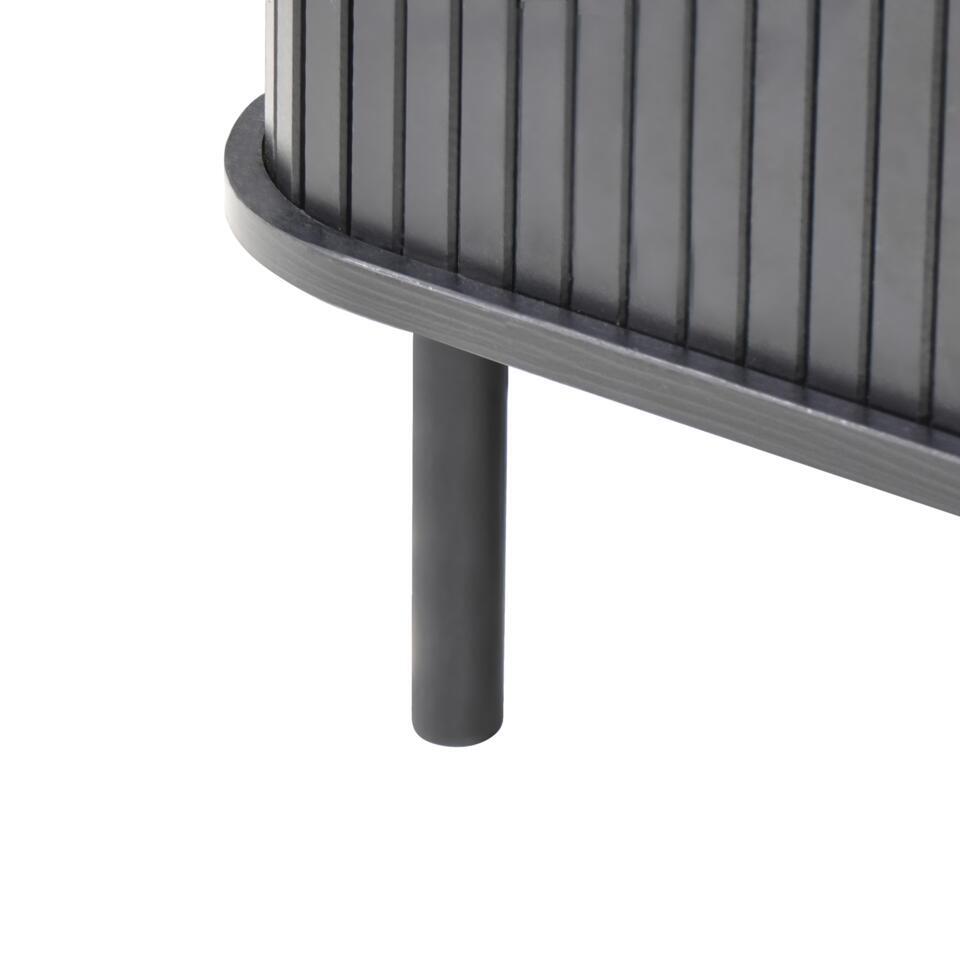Retro salontafel met schuifdeuren. Richt je kamer in met deze salontafel en organiseer de kamer dankzij het ontwerp. Dit chique meubel heeft twee slanke schuifdeuren die ruime opbergruimte verbergen voor je boeken, kaarsen en andere benodigdheden voor de woonkamer, zodat je een rommelvrije omgeving hebt. Het retro design van het meubel, gecombineerd met de zwarte tint en zwarte poten, zorgen ervoor dat het opvalt en past bij verschillende interieurstijlen. Bovendien garanderen de hoogwaardige materialen die voor de constructie zijn gebruikt niet alleen eenvoudig onderhoud, maar ook duurzaamheid, waardoor het een praktische en stijlvolle toevoeging aan je huis is.