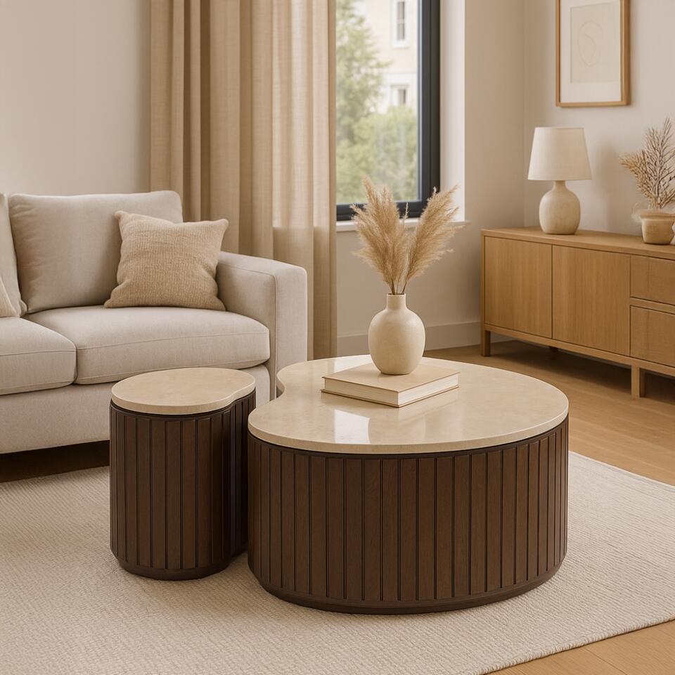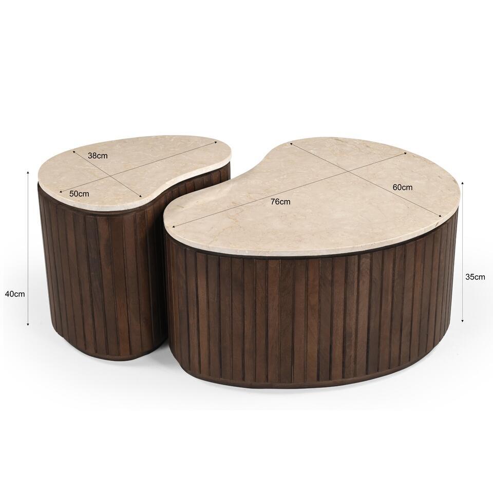 Laat je interieur tot leven komen met de bijzondere vormen van salontafelset Sorai. Deze set bestaat uit twee tafels met een elegant golvend silhouet, geïnspireerd op de vormen uit de natuur. Het warme houten onderstel met verfijnde latstructuur en het zachte natuurstenen blad vormen samen een stijlvol geheel dat rust én karakter uitstraalt.Dankzij de speelse asymmetrie en het praktische bij elkaar schuiven is deze set niet alleen mooi om te zien, maar ook functioneel in gebruik.