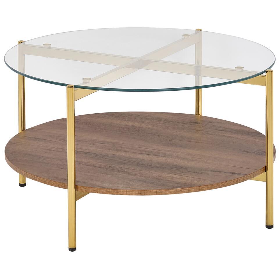 Decoratieve salontafel. Deze elegante ronde salontafel heeft een blad van gehard glas op een slank frame van gouden metaal, dat een vleugje luxe toevoegt aan elke woonruimte. De onderste plank, met zijn natuurlijke hout-knop effect, voegt zowel stijl als functionele opslag toe. Deze tafel is uitgerust met plastic doppen om je vloer te beschermen, waardoor hij zowel praktisch als stijlvol is. Hij is perfect om decorstukken op te zetten of essentiële spullen binnen handbereik te houden, aangezien hij een modern design combineert met een vleugje natuurlijke charme.