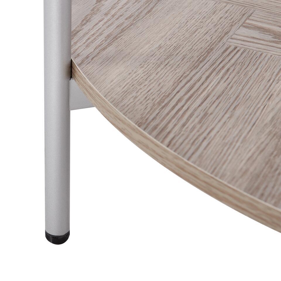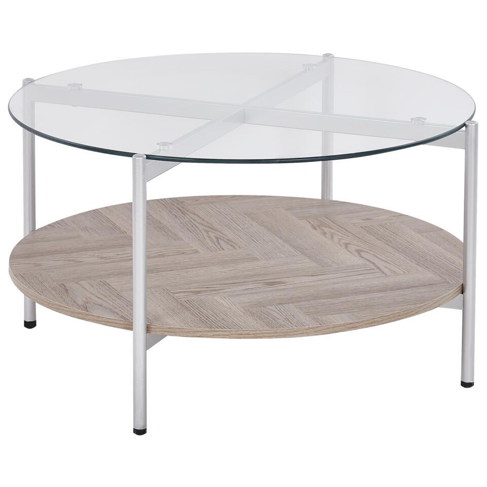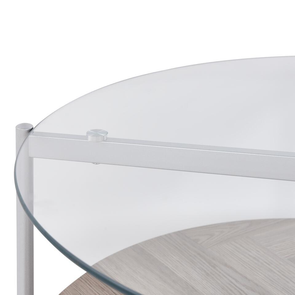 Decoratieve salontafel. Deze elegante ronde salontafel heeft een blad van gehard glas op een slank frame van zilveren metaal, dat een vleugje luxe toevoegt aan elke woonruimte. De onderste plank, met zijn natuurlijke hout-knop effect, voegt zowel stijl als functionele opslag toe. Deze tafel is uitgerust met plastic doppen om je vloer te beschermen, waardoor hij zowel praktisch als stijlvol is. Hij is perfect om decorstukken op te zetten of essentiële spullen binnen handbereik te houden, aangezien hij een modern design combineert met een vleugje natuurlijke charme.
