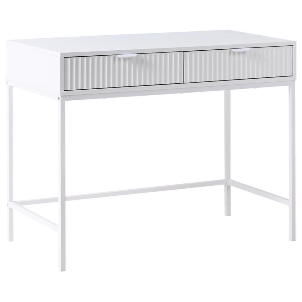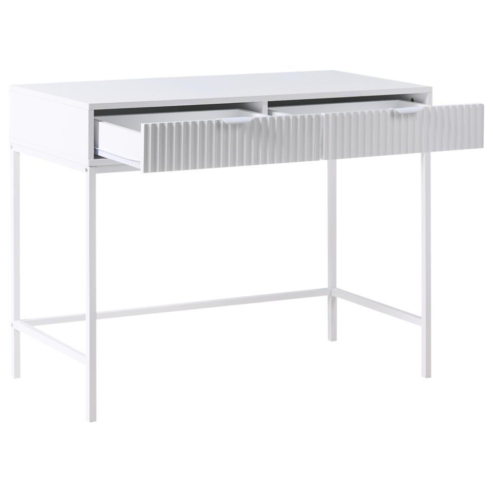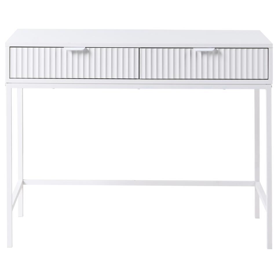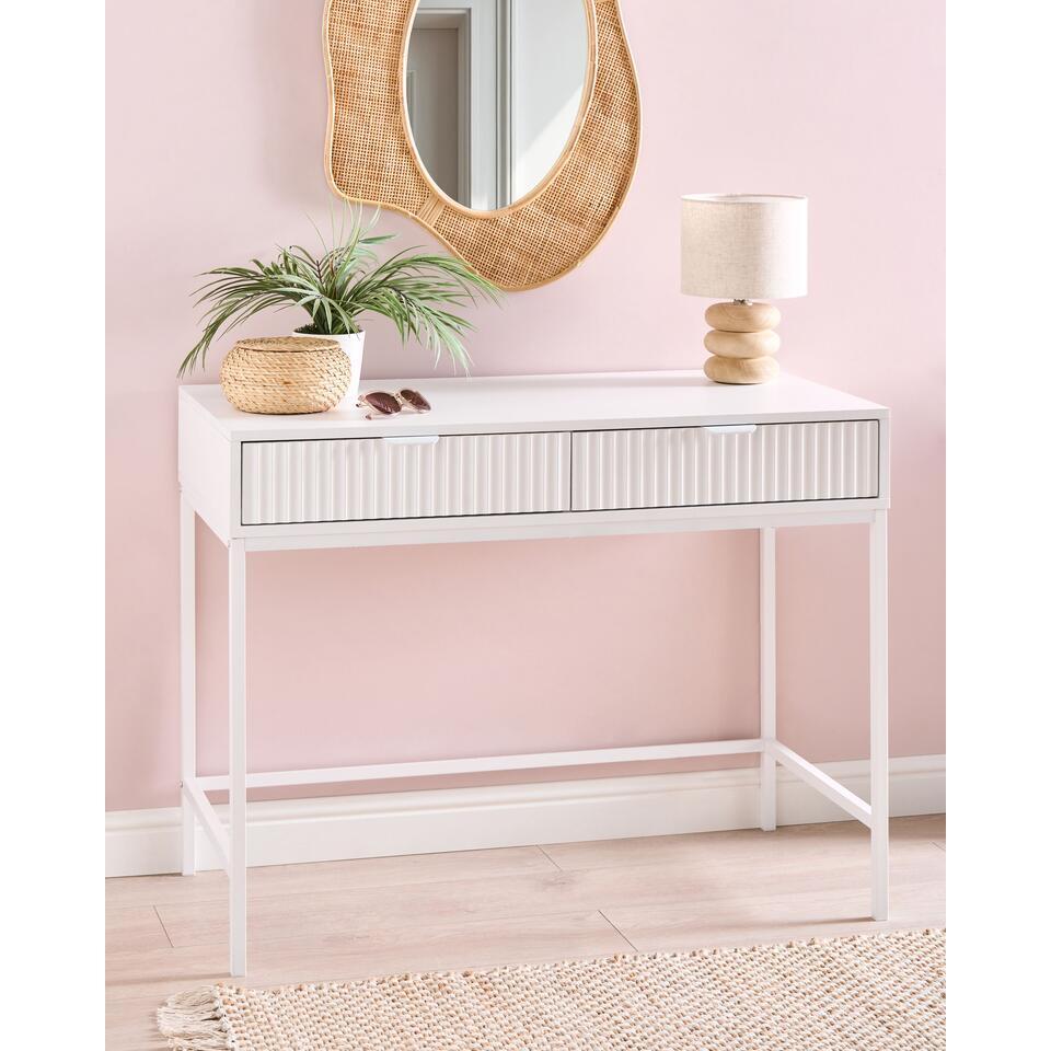Moderne wandtafel met laden. Voeg tijdloze elegantie toe aan je hal of woonkamer met deze stijlvolle consoletafel. Hij is gemaakt van stevig MDF, heeft een witte afwerking en opvallende geribbelde fronten die het ontwerp een subtiele textuur en karakter geven. De twee ruime lades bieden praktische opbergruimte voor dagelijkse benodigdheden, terwijl het slanke silhouet en de verhoogde poten zorgen voor een lichte, moderne uitstraling. Deze consoletafel is perfect om te stylen met decoratieve accenten, is zowel functioneel als mooi veelzijdig en past zowel in moderne als klassieke interieurs.