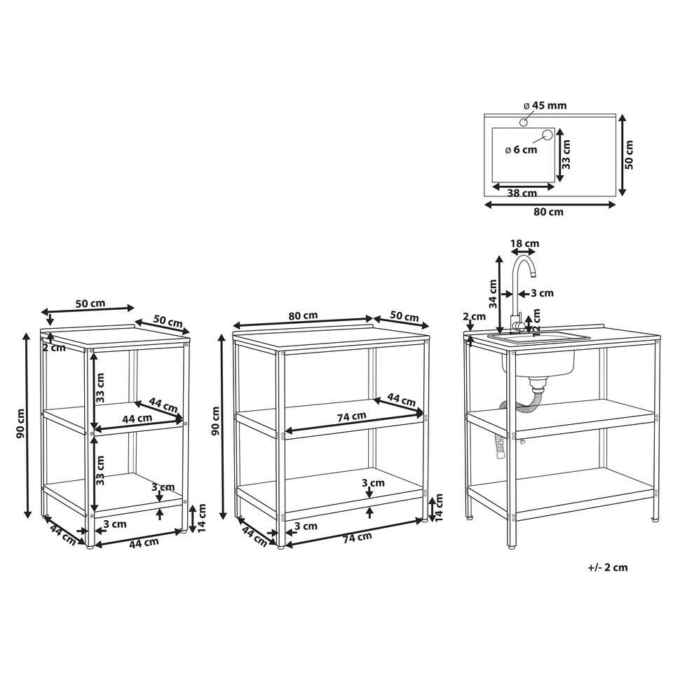 Buitenkeuken set. Deze tuinkeukenset, ontworpen voor optimaal gebruiksgemak, bestaat uit drie opslageilanden, waarvan één met een ingebouwde gootsteen en een eenhendeluitloop. De open schappen zijn perfect voor het opbergen van voedsel en keukenaccessoires. Met deze set kun je bij je gasten blijven terwijl je buiten maaltijden bereidt, zodat je je niet steeds hoeft terug te trekken in je binnenkeuken. De meubels zijn gemaakt van roestvrij staal met poedercoating en zijn volledig voorbereid op buitengebruik, waardoor duurzaamheid gegarandeerd is. De praktische constructie omvat een gootsteen met een enkele mengkraan en een ruim tafelblad, perfect om ingrediënten voor te bereiden of te gebruiken als grillstation, zodat je kunt genieten van het plezier van buiten koken.