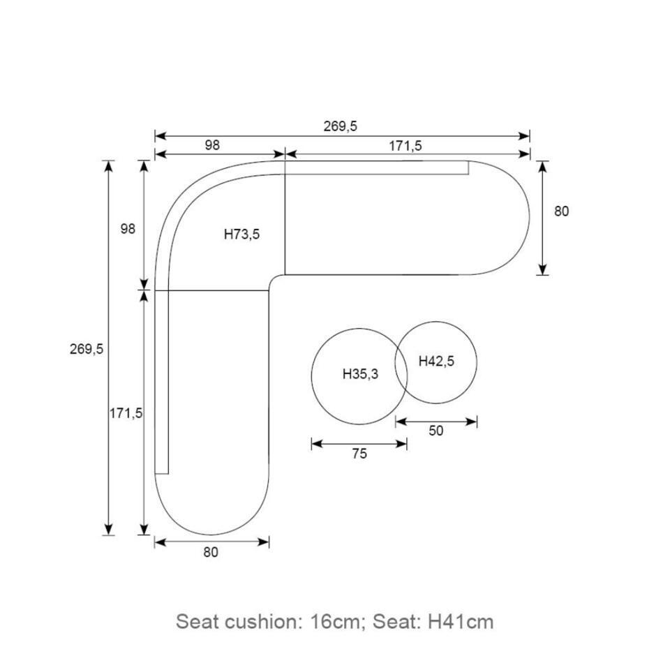 De loungeset heeft een afmeting van 269,5 bij 269,5 cm en heeft een hoogte van 73,5 cm. Het frame heeft een taupe kleur coating met zandkleurig touw afwerking. De kussens hebben een valley zand kleur.