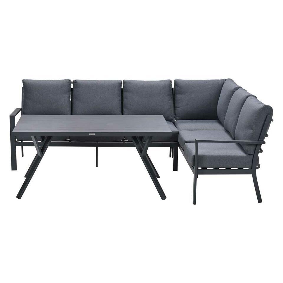 De Senja lounge dining set is vervaardigd van onderhoudsvrij en weerbestendig aluminium, voorzien van een duurzame donker grijze poedercoating. Dit maakt de set gemakkelijk te onderhouden. Als de set vies wordt door bijvoorbeeld opspattend regenwater, kun je deze moeiteloos reinigen met een sopje van groene zeep en een zachte doek. Deze veelzijdige lounge dining set kan worden uitgebreid met een lounge dining stoel en een sportbankje. De tafel heeft een lattenstructuur en brede platte tafelpoten, wat het geheel een strak en eigentijds design geeft. Bovendien beschikt de set over verstelbare pootdopjes, waardoor je de set gemakkelijk waterpas kunt zetten.