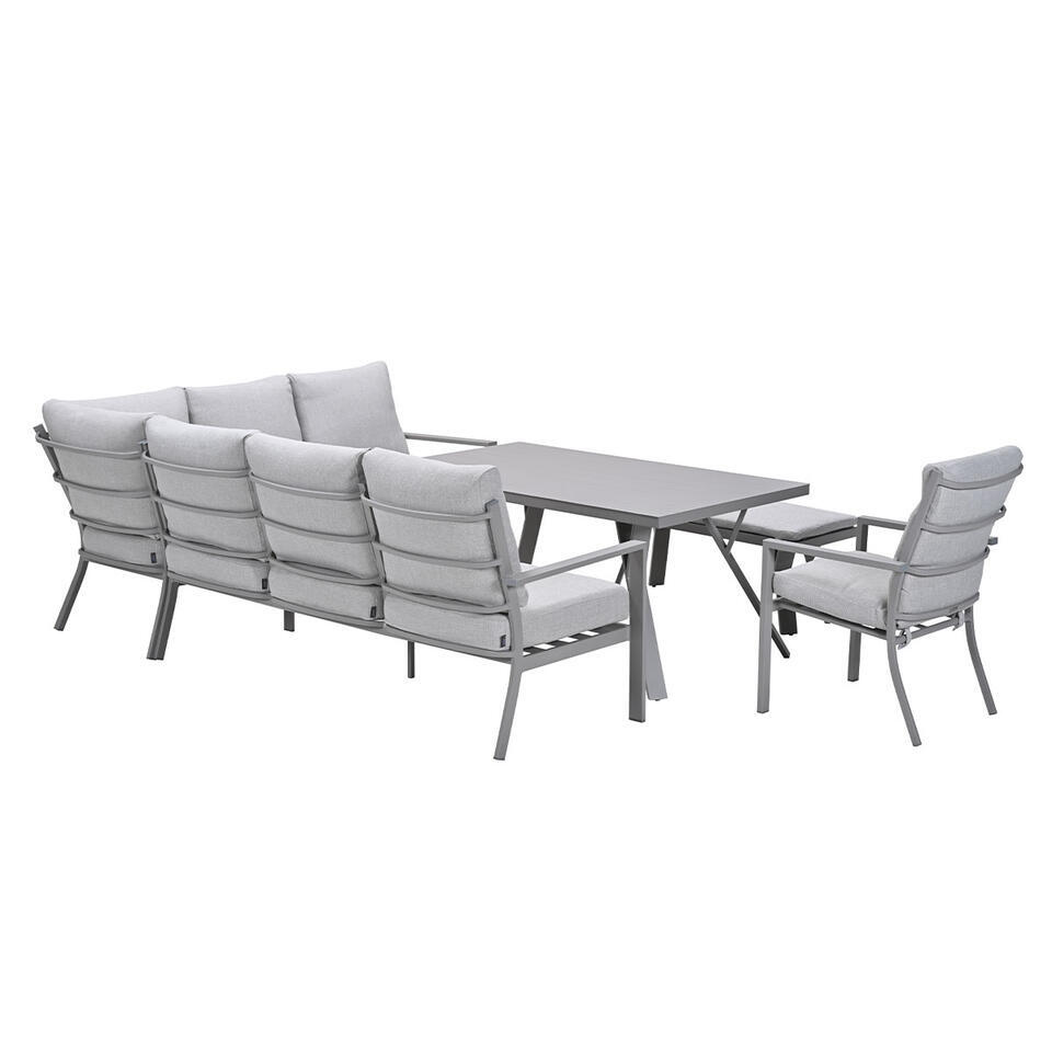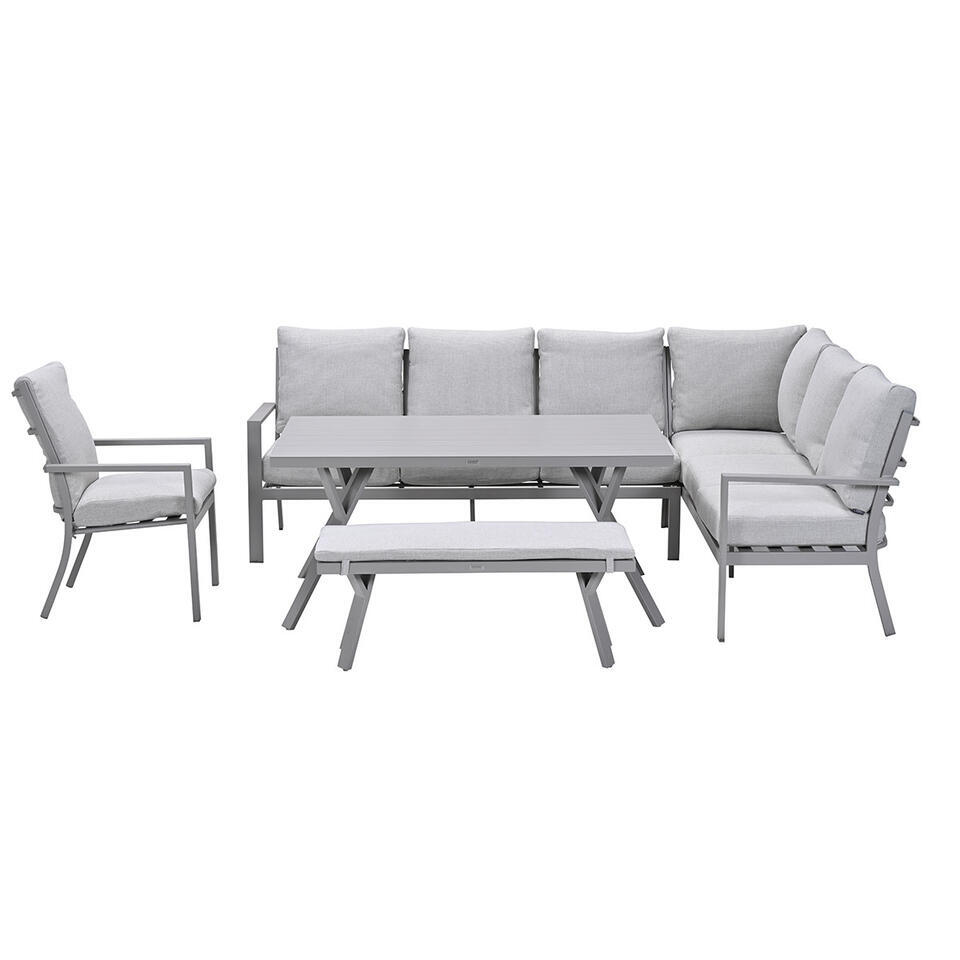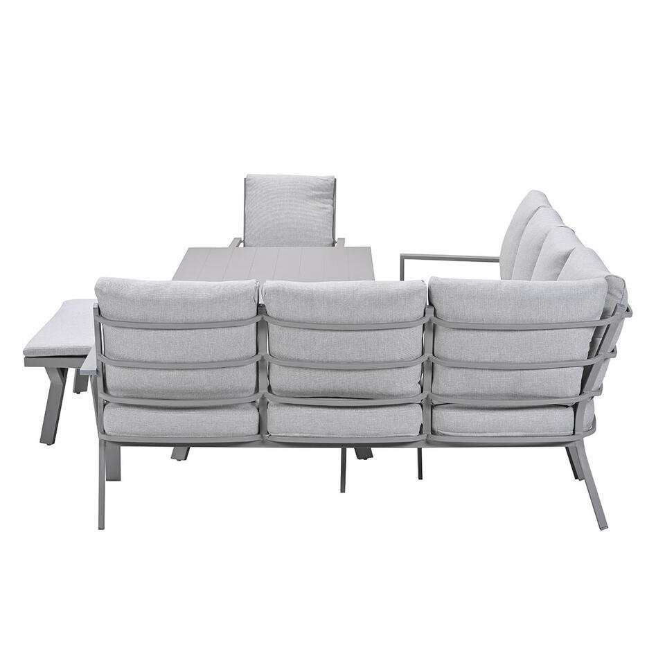 De meegeleverde dikke kussens zijn gemaakt van een hoogwaardige kwaliteit polyester. De kussens zijn voorzien van een rits waardoor de hoezen gemakkelijk met de hand gewassen kunnen worden. De kussens zijn niet waterbestendig en kunnen na gebruik worden opgeborgen in de schuur of in een kussenbox. Wel zijn de kussens voorzien van een waterafstotende coating. Dit is vooral erg praktisch als er bijvoorbeeld op het kussen wordt gemorst met drinken, je veegt het vocht er namelijk gemakkelijk weer af. Deze lounge dining set bestaat uit twee driepersoons banken en een lounge dining tafel met bijpassende sportbank en stoel voor een extra zitplekken.