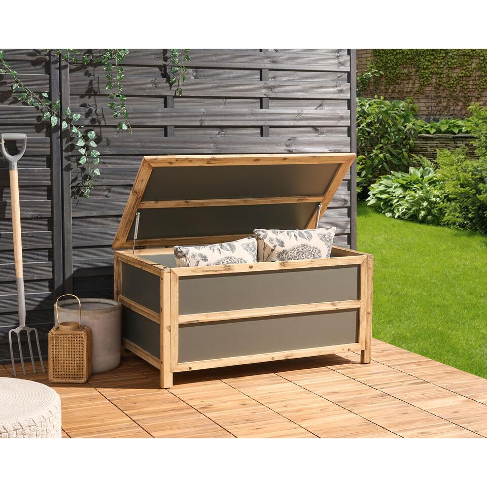 Buiten kussen opbergdoos met houten frame. Deze stevige opbergbox is de perfecte oplossing om je gereedschap en accessoires buiten georganiseerd te houden. Hij is gemaakt van hoogwaardig beton met een robuust houten frame en combineert duurzaamheid met een stijlvolle touch. Hij is ontworpen voor tuinen in industriële stijl, gaat lang mee en geeft je buitenruimte een klassieke, gestructureerde look.