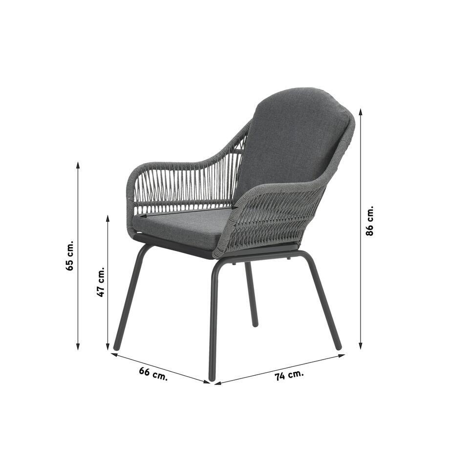 De Yima tuinstoel is in twee kleurstellingen verkrijgbaar: donker grijs met licht grijs rope en mystic grijze kussens of donker grijs met mos groen rope en mystic grijze kussens.