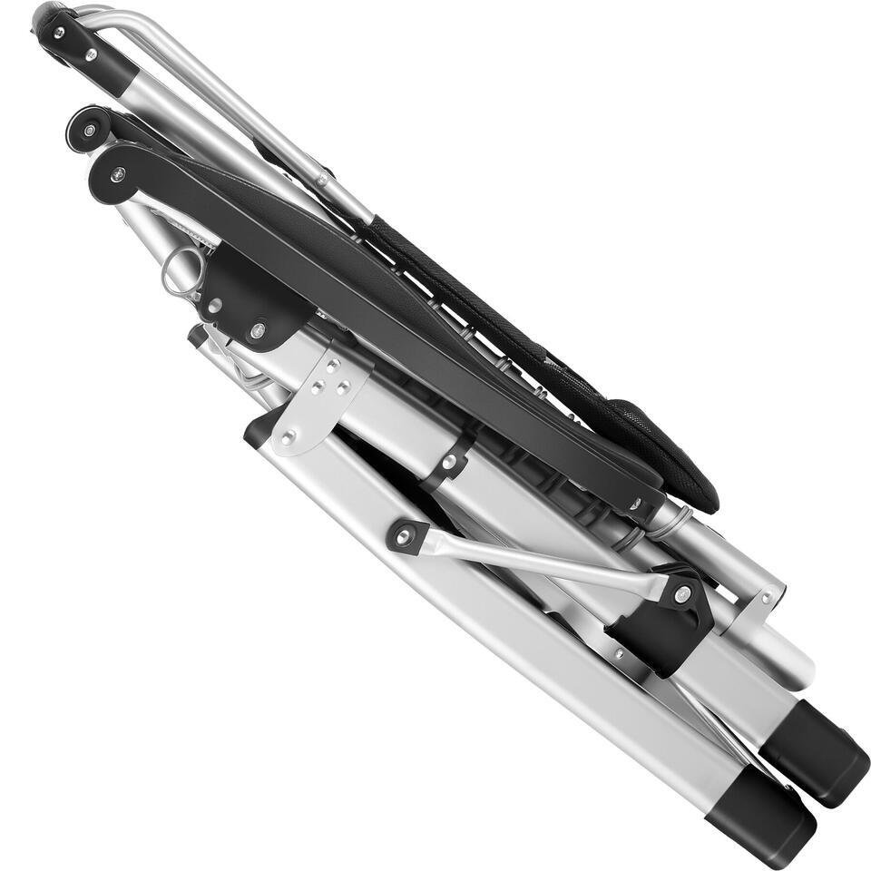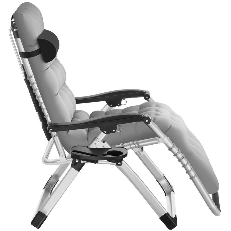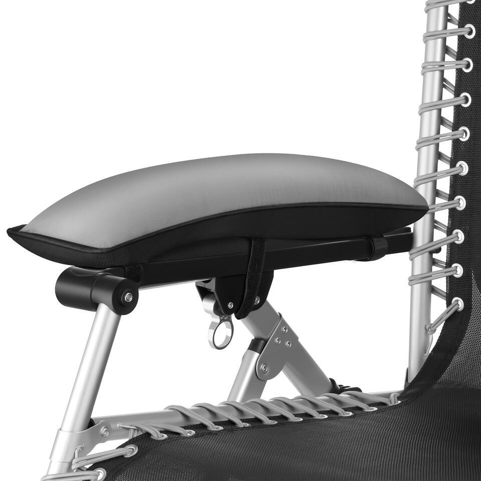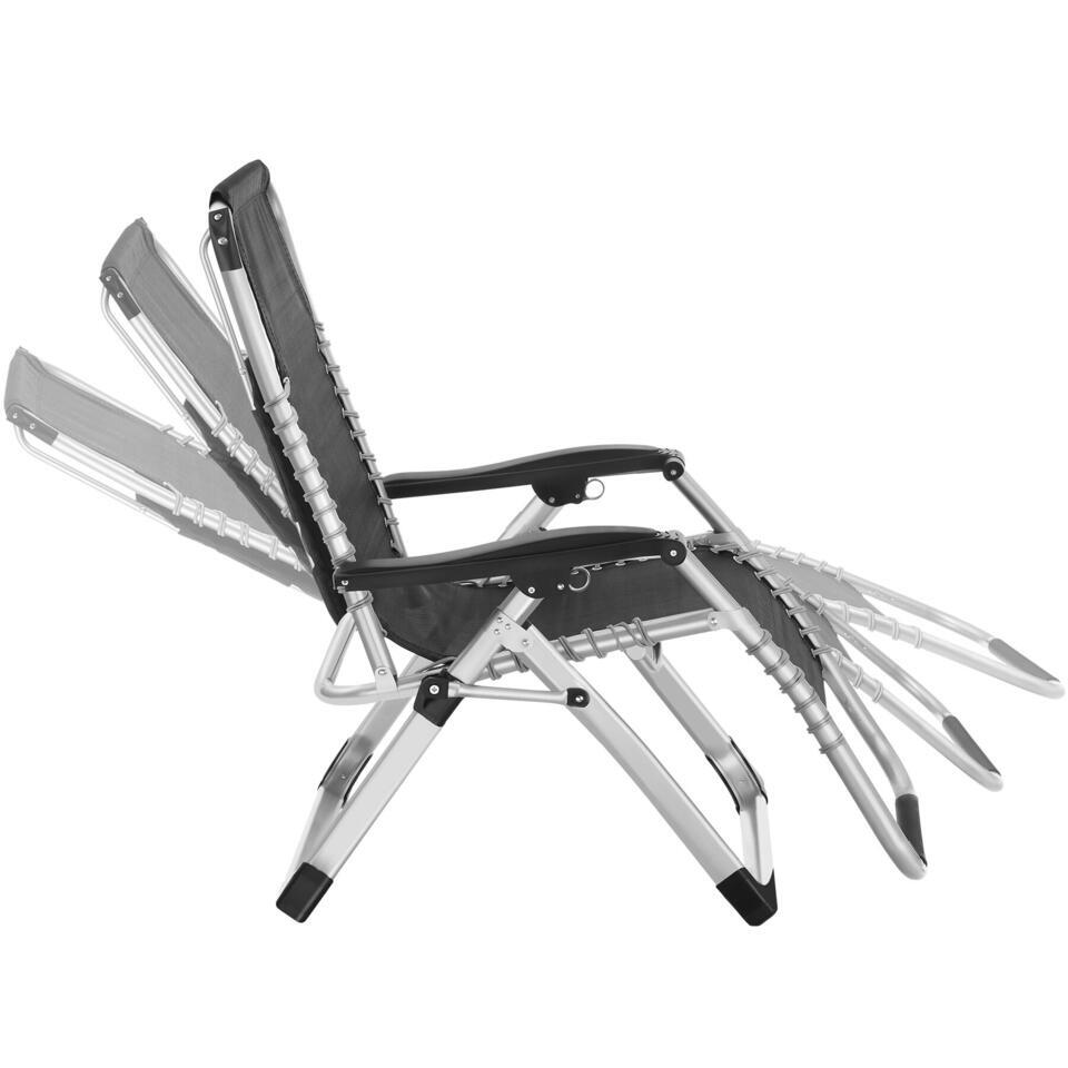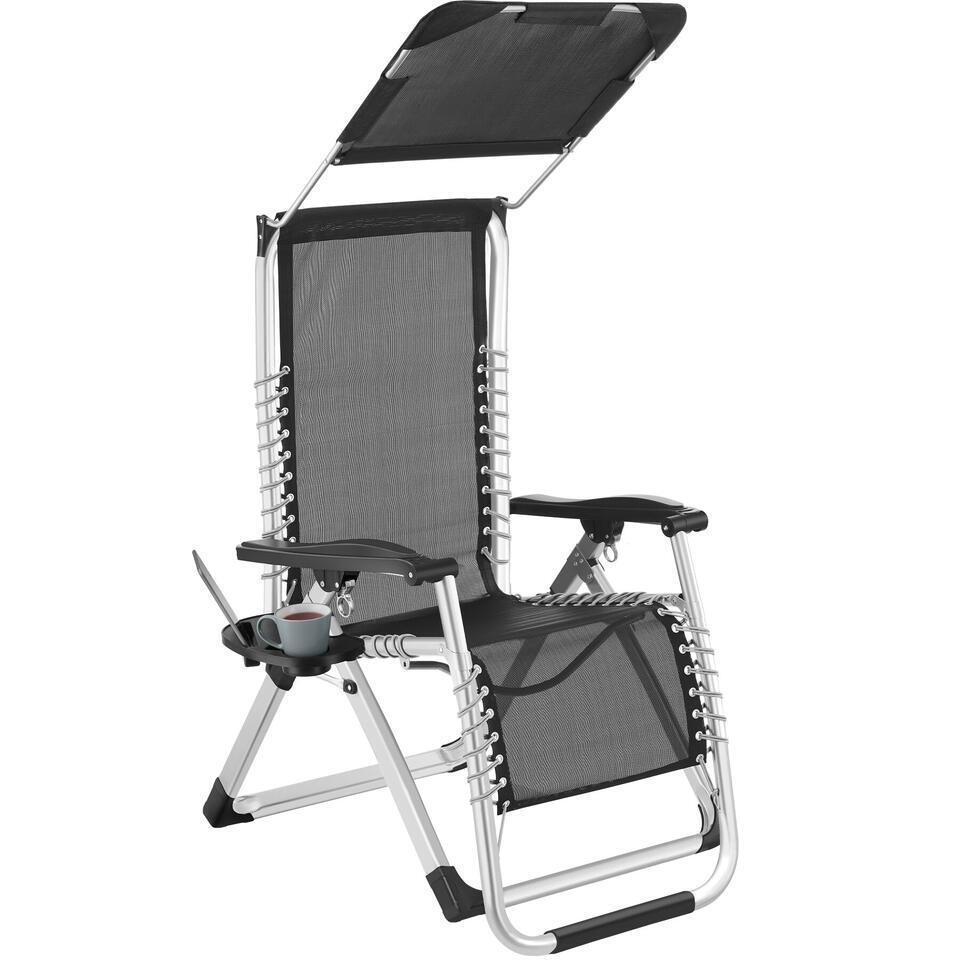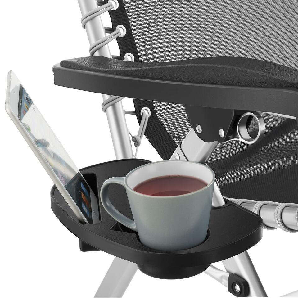Het gepoedercoate stalen frame scoort niet alleen met een enorme stabiliteit en draagkracht. Een zijtafeltje biedt plaats voor drankjes en je mobieltje, terwijl een geïntegreerde opbergtas ruimte biedt voor tijdschriften, zonnebrand en meer.