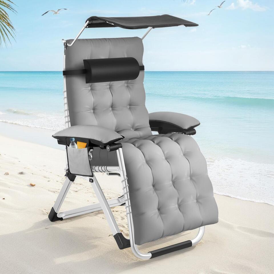 tectake Ligstoel Cloud II met zonnekap, opvouwbaar, Lichtgrijs