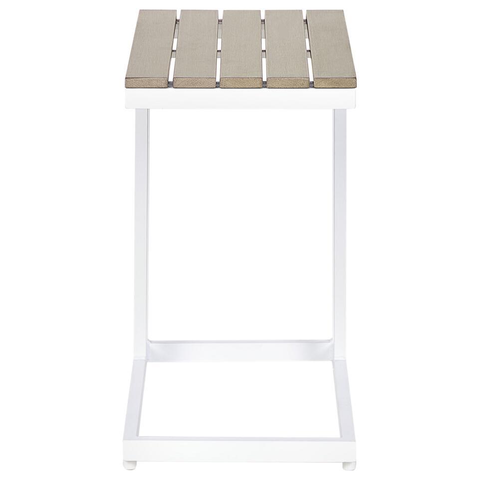 Plastic houten buitentafeltje. Verbeter je tijd buiten met deze stijlvolle en praktische bijzettafel. Het blad met latten is gemaakt van kunststof hout en is de ideale plek om te genieten van een kopje koffie, terwijl het slanke aluminium frame een poedercoating heeft voor een duurzame afwerking. Het tweekleurige ontwerp past bij elke moderne buiteninrichting.