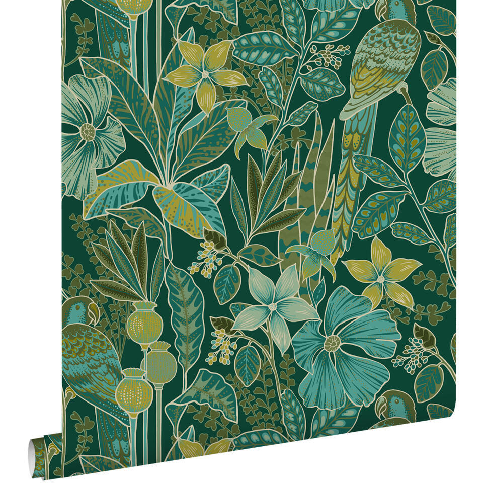 ESTAhome behangpapier - tropische bloemen en paradijsvogels - donkergroen