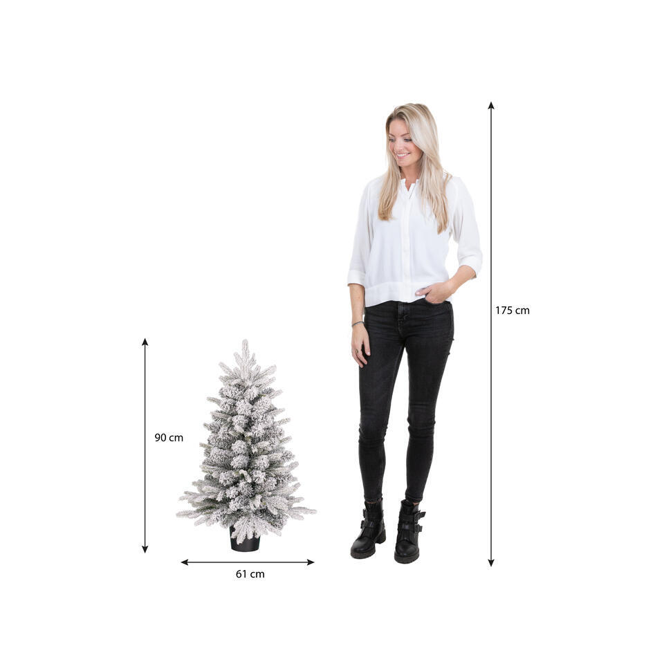 Ontdek de winterse charme van de Grimshaw kunstkerstboom van Black Box Trees. Deze prachtige kerstboom is groen met een dikke laag kunstsneeuw. Hierdoor lijkt het net alsof er versgevallen sneeuw op de takken ligt - prachtig! De Grimshaw is een uitblinker in kwaliteit en echtheid. De buitenste takken zijn namelijk gemaakt van PE voor een realistische uitstraling en de binnenste takken hebben zachte PVC naalden voor een volle uitstraling. Dankzij de handige vouwconstructie hoef je de takken alleen uit te vouwen en shapen en hierdoor zet je de kunstkerstboom met sneeuw snel en moeiteloos op! Hierdoor houd je meer tijd over voor het versieren van de boom! Verder heeft de boom een hoogte van 90 cm, een diameter van 61 cm en heeft hij 120 tips. Hij wordt geleverd met 2 jaar garantie. Kortom: de kunstkerstboom voor een zorgeloze en mooie kerst!