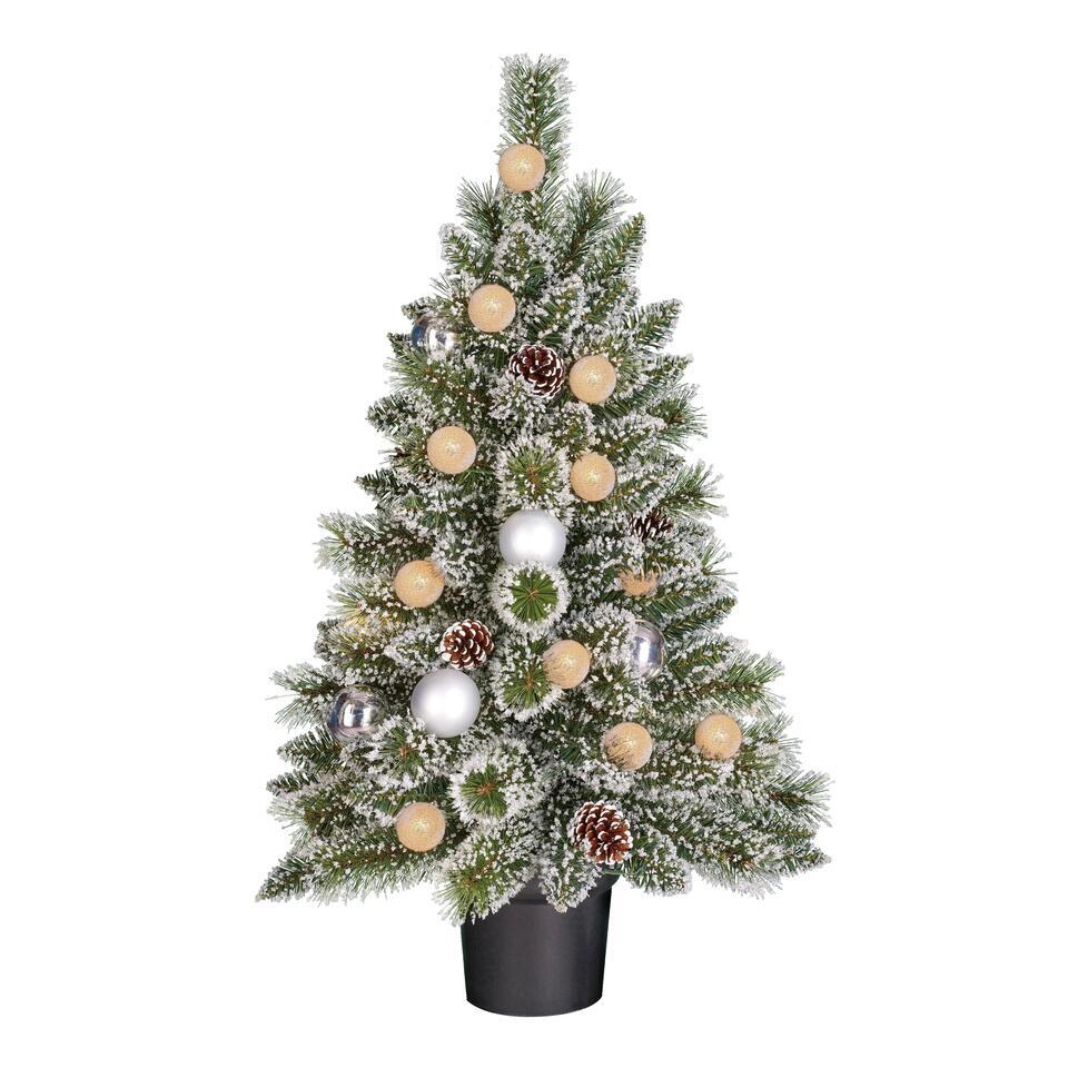 Met de sfeervolle Kaprun kunstkerstboom van Black Box Trees heb je direct een compleet versierde kerstboom in huis. De takken met subtiel bevroren naaldjes zijn prachtig versierd met elegante zilverkleurige decoraties. Deze kerstboom heeft 20 LED-lampjes die warm wit licht geven en beschikt over een praktische timerfunctie. Doordat hij werkt op 2 AA-batterijen, plaats je hem overal gemakkelijk zonder snoeren. De boom bestaat uit 90 stevige dennentakjes met een mix van harde en zachte PVC-naalden, waardoor hij vol en natuurlijk oogt. Dankzij de eenvoudige vouwconstructie zet je hem snel en moeiteloos op. De Kaprun kunstkerstboom heeft een handige compacte afmeting van 90 cm hoog en 51 cm in diameter, ideaal voor sfeervolle hoekjes, bijzettafels of in kleinere ruimtes. Zowel de kerstboom als de verlichting hebben een garantie van 2 jaar.