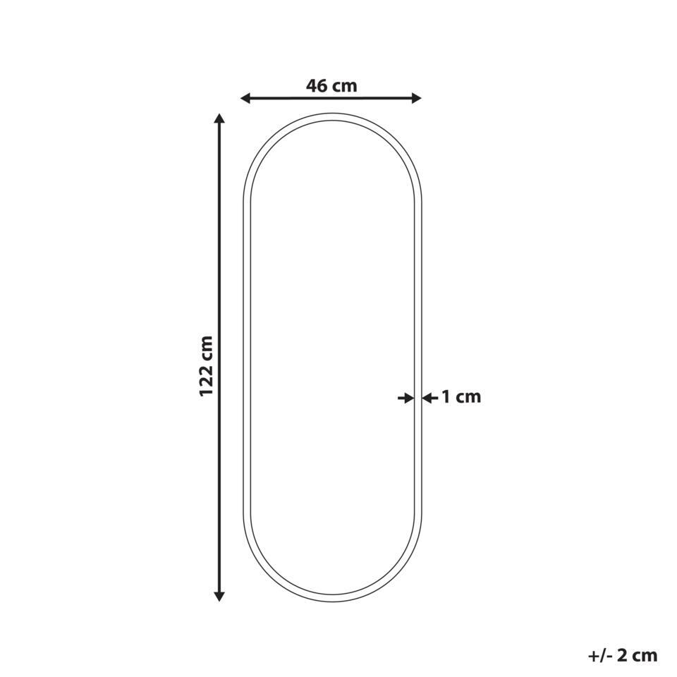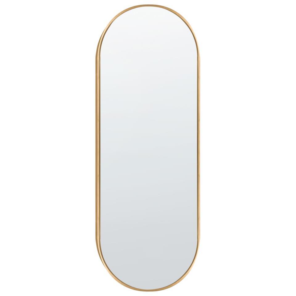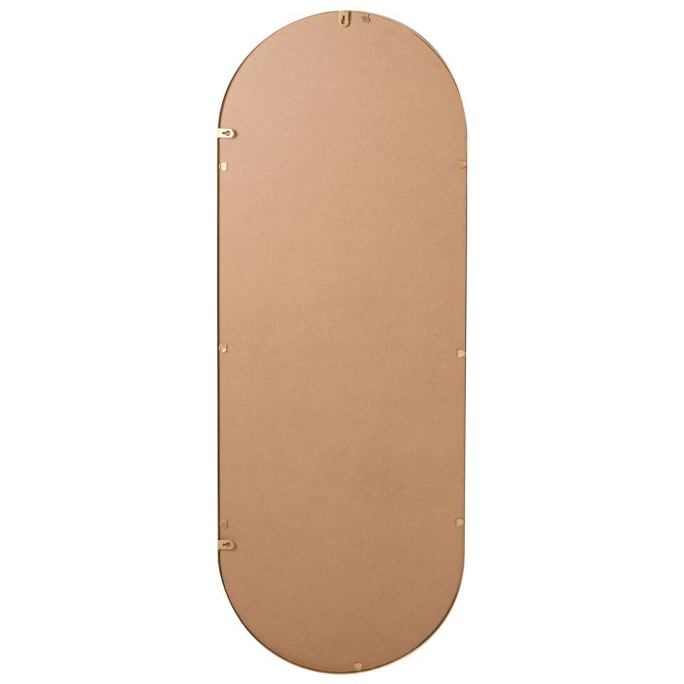 Ovale hangende spiegel. Deze ovale wandspiegel heeft een chique goudkleurig metalen frame en voegt een vleugje moderne elegantie toe aan elk interieur. De duurzame constructie zorgt ervoor dat de spiegel er jarenlang onberispelijk blijft uitzien, terwijl drie geïntegreerde haken zowel verticale als horizontale plaatsing mogelijk maken, wat erg handig is. Het grote glazen oppervlak weerkaatst het licht perfect, waardoor de kamer helderder en visueel groter wordt. Deze veelzijdige spiegel is een aanvulling op verschillende inrichtingsstijlen en past vooral in een verfijnde slaapkamer of als geraffineerd accent in een hedendaagse woonkamer.