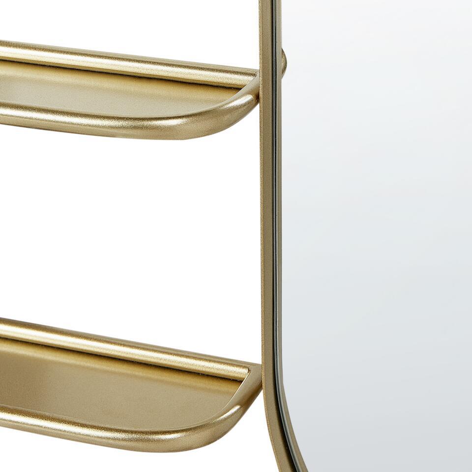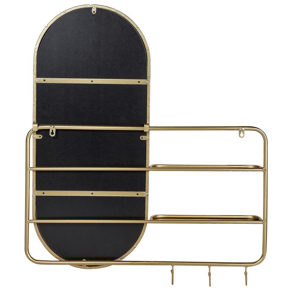 Hangende spiegel met haken en planken. Deze moderne wandspiegel van duurzaam ijzer met een chique gouden afwerking combineert moeiteloos stijl en functionaliteit. Het strakke ontwerp heeft geïntegreerde planken en haken, perfect voor het organiseren van sleutels, accessoires en andere benodigdheden. Deze spiegel is ideaal voor in de hal of slaapkamer, en voegt elegantie toe en houdt je ruimte vrij van rommel.