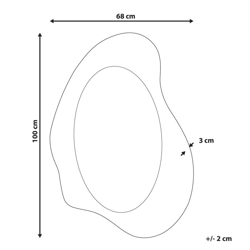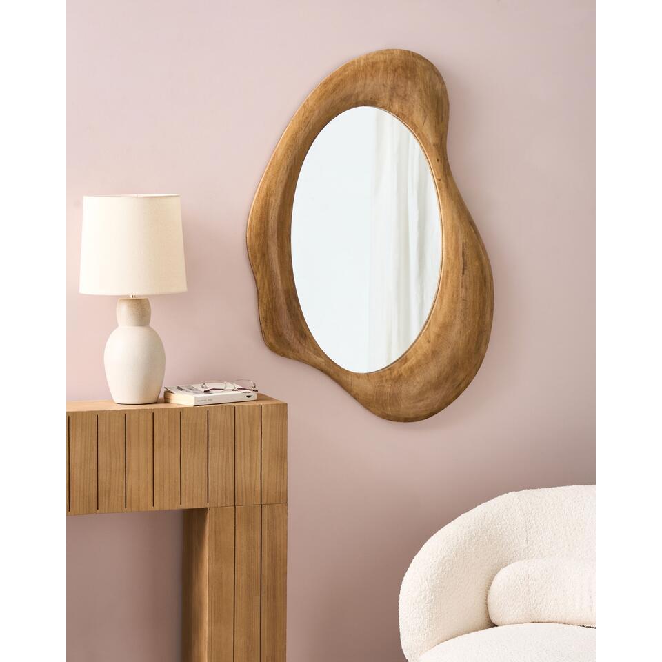 Houten hangende spiegel met asymmetrisch frame. Deze decoratieve hangende spiegel is de perfecte manier om een retro tintje aan je interieur toe te voegen. Het asymmetrische frame is gemaakt van duurzaam rubberhout en geeft elke ruimte een interessante twist. De warme bruine kleur past bij verschillende interieurs en versterkt de algehele esthetiek. Dankzij de geïntegreerde haken is deze spiegel snel en eenvoudig op te hangen.