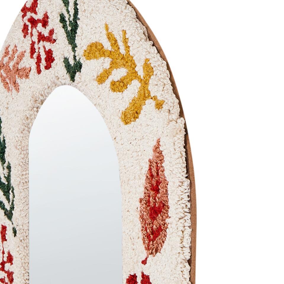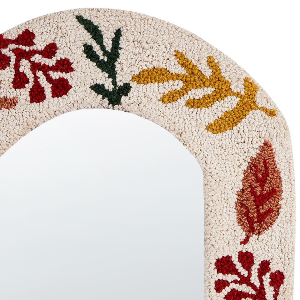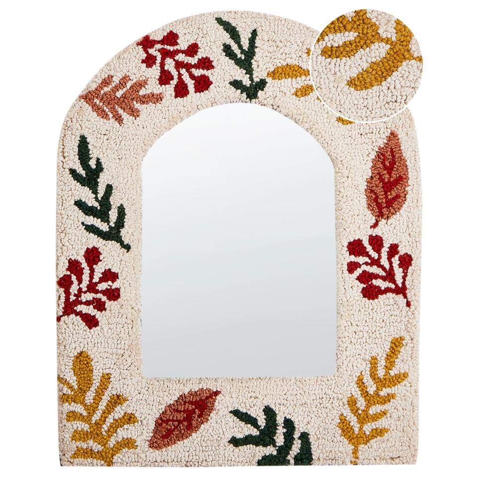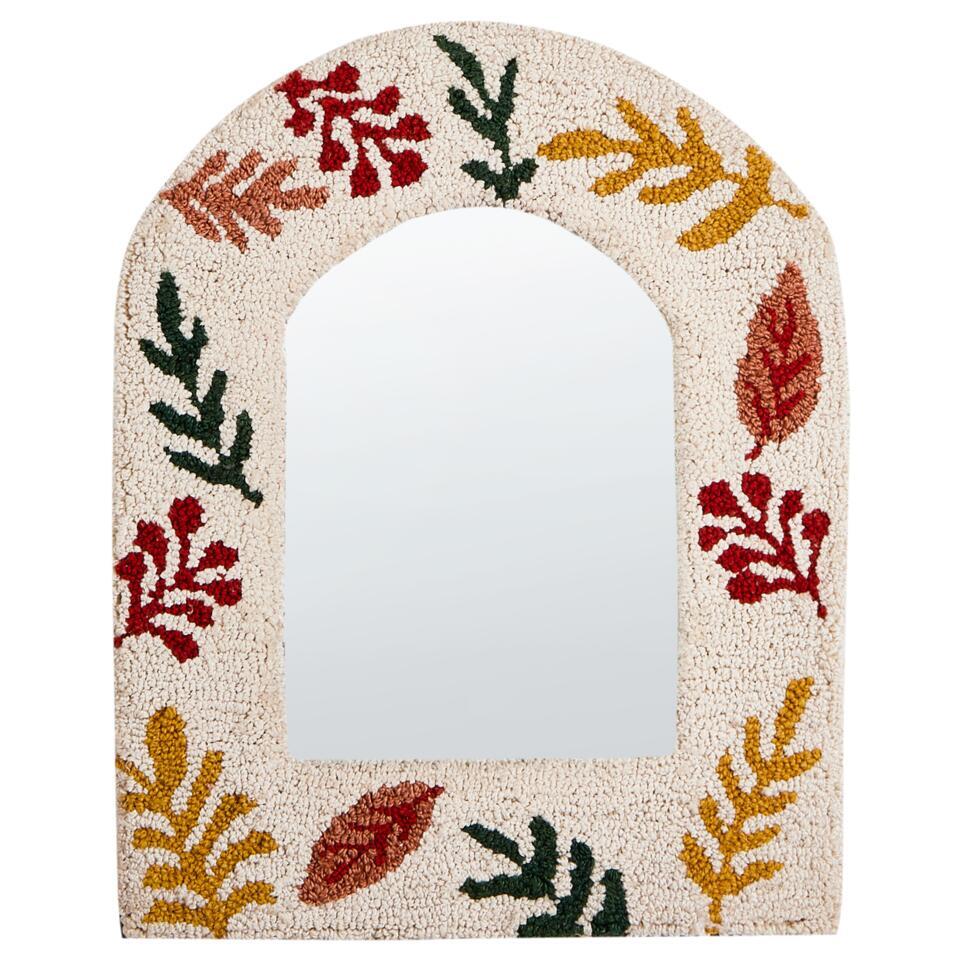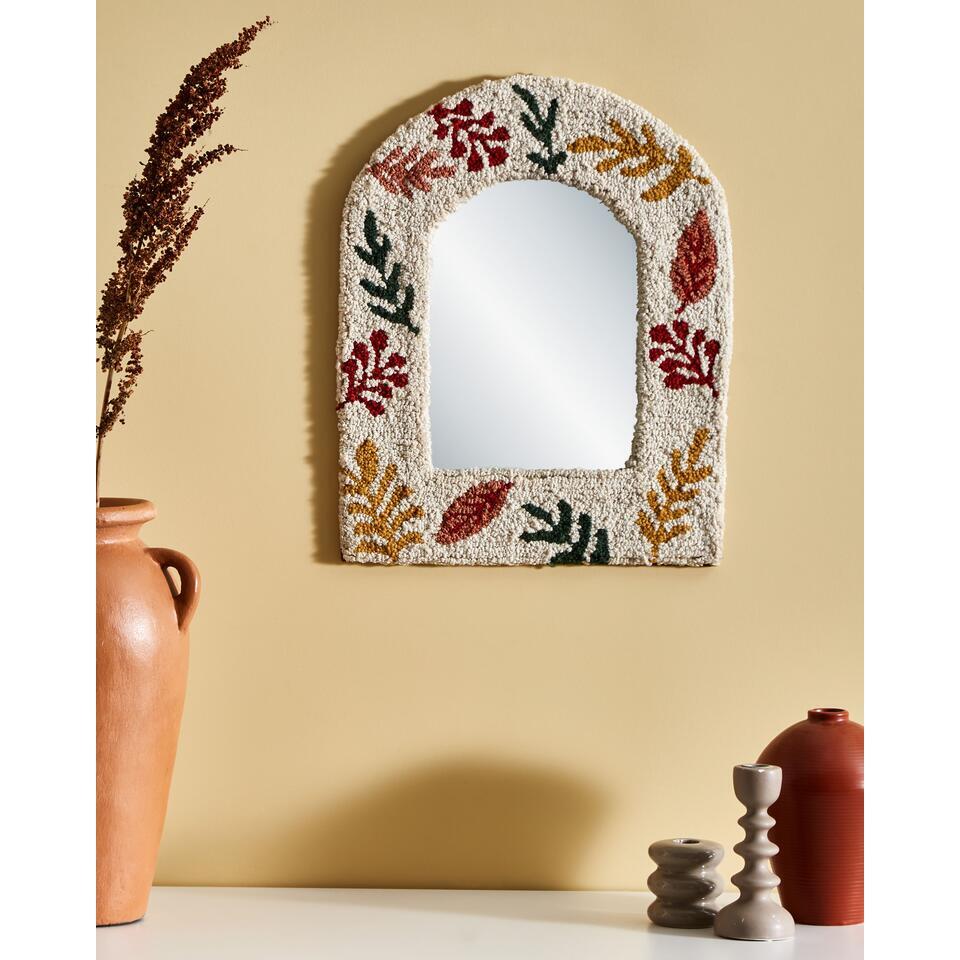 Getufte decoratieve spiegel met katoen. Deze decoratieve wandspiegel voegt met zijn katoenen frame een vleugje karakter toe aan elke kamer. Het levendige, op bladeren geïnspireerde patroon in warme herfstkleuren brengt een gezellige, uitnodigende sfeer in je kamer. Met de ingebouwde haken is hij gemakkelijk op te hangen en geeft hij je interieur een extra dimensie. Een perfecte combinatie van stijl en functionaliteit voor je muren.