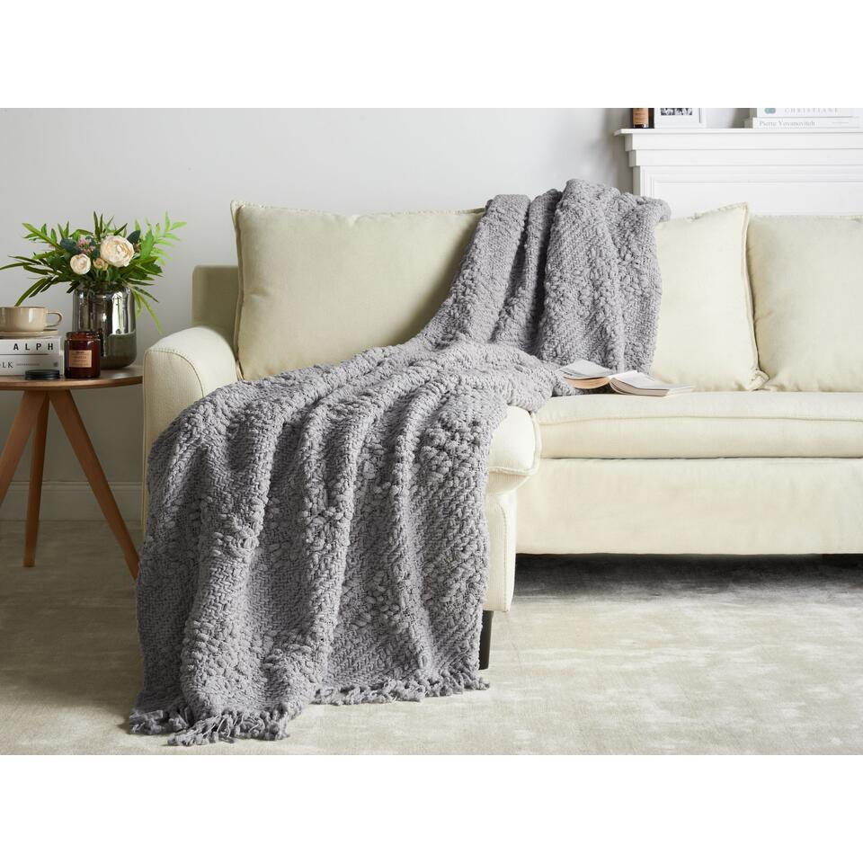Geweven plaid met kwastjes. Deze deken van zacht katoen met acryl is een must-have voor elk knus interieur. De geweven, lusachtige textuur, gecombineerd met speelse kwastjes, geeft het een boho vibe. Of je nu lekker knus op de bank zit of een laagje warmte aan je bed toevoegt, deze deken houdt je het hele seizoen warm en comfortabel.