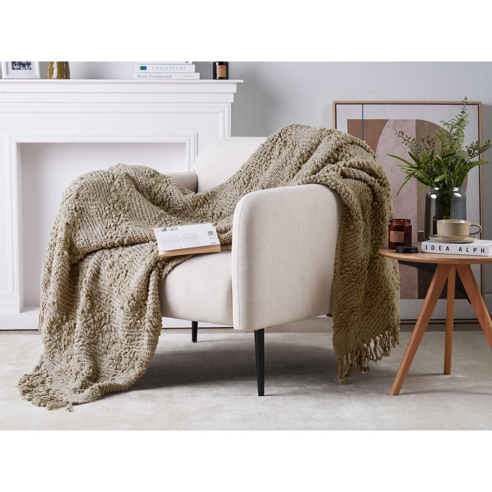 Geweven plaid met kwastjes. Deze deken van zacht katoen met acryl is een must-have voor elk knus interieur. De geweven, lusachtige textuur, gecombineerd met speelse kwastjes, geeft het een boho vibe. Of je nu lekker knus op de bank zit of een laagje warmte aan je bed toevoegt, deze deken houdt je het hele seizoen warm en comfortabel.