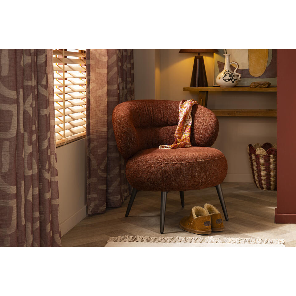 De ronde vormen en knusse uitstraling maken deze fauteuil tot een echte sfeermaker. De natuurlijke, bruine kleur voegt warmte toe aan je interieur en laat zich moeiteloos combineren met neutrale of aardse tinten.