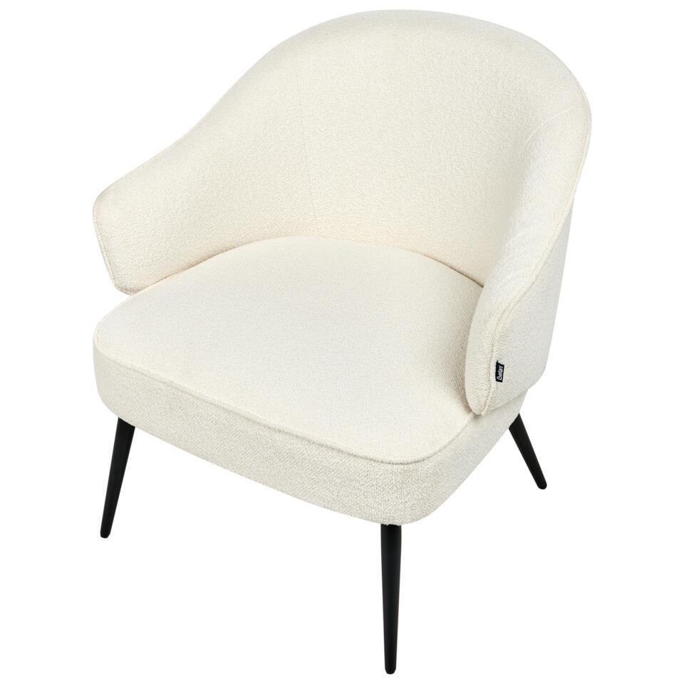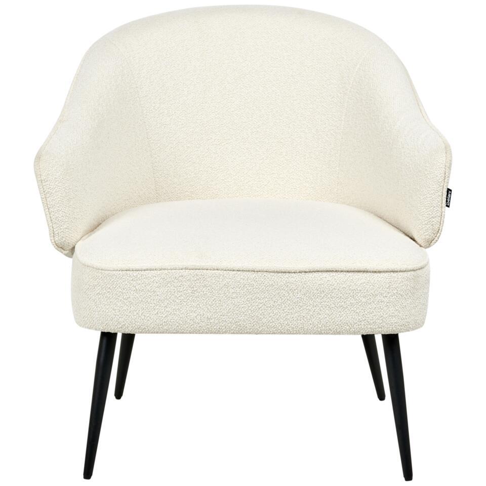 Knusse fauteuil in teddy-stijl. Deze fauteuil is een comfortabele en visueel aantrekkelijke aanvulling op elke woonkamer. De ronde zitting en rugleuning zijn bekleed met zachte off-white bouclé stof en bieden zowel ondersteuning als een gezellige uitstraling. De gepoedercoate metalen poten zorgen voor stabiliteit en voegen een subtiel visueel contrast toe. Hij past goed in moderne of industriële interieurs. Perfect als extra zitplaats of als decoratief element in je relaxhoek.