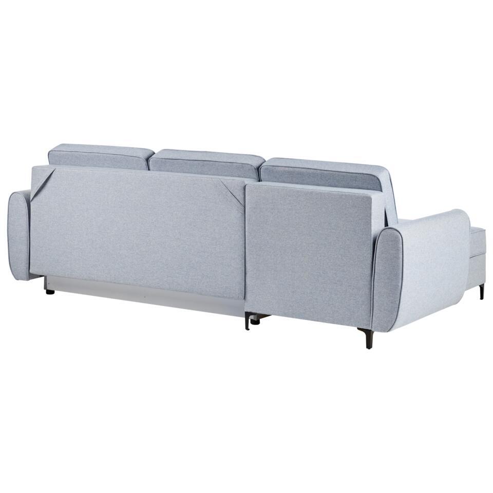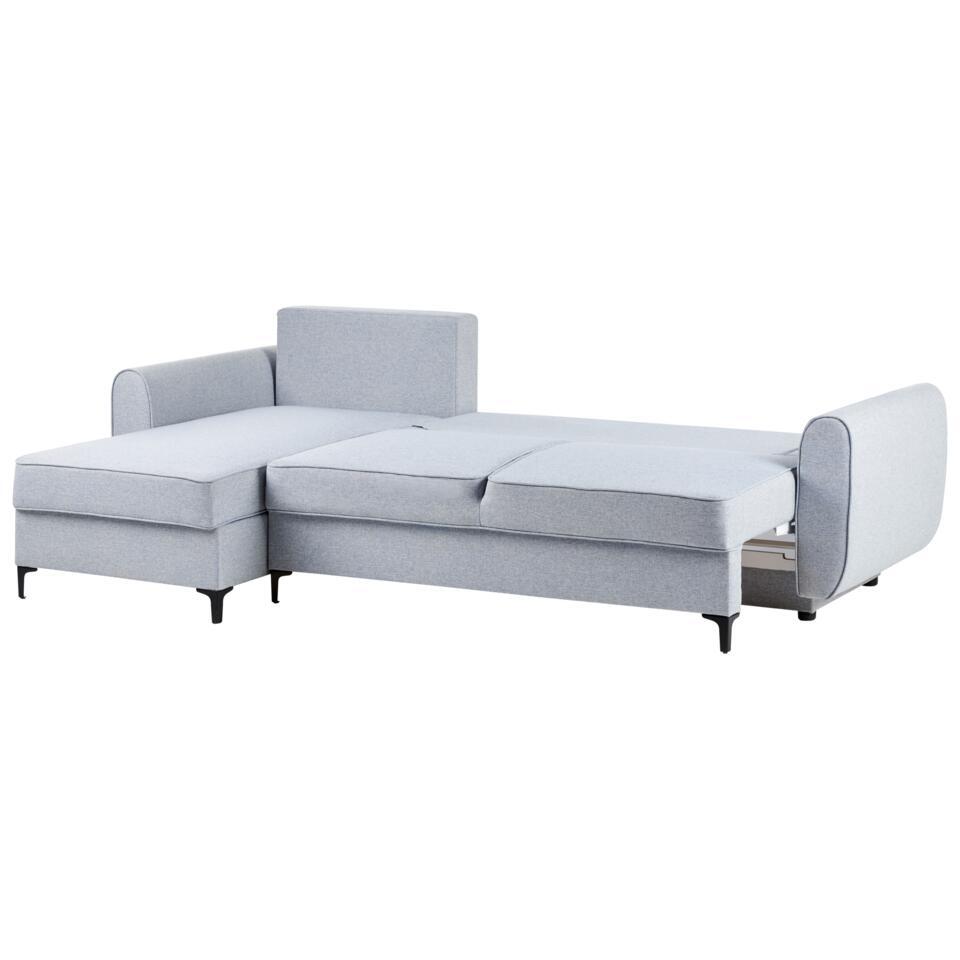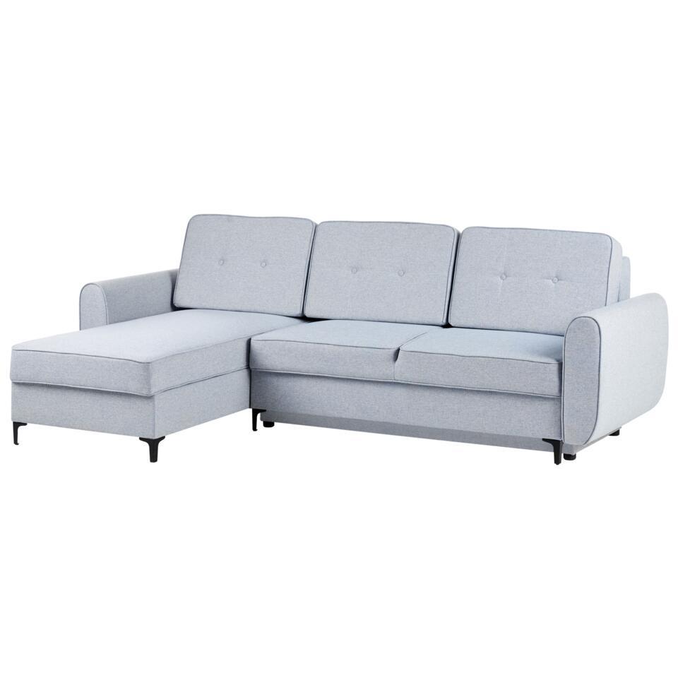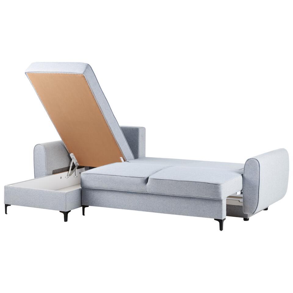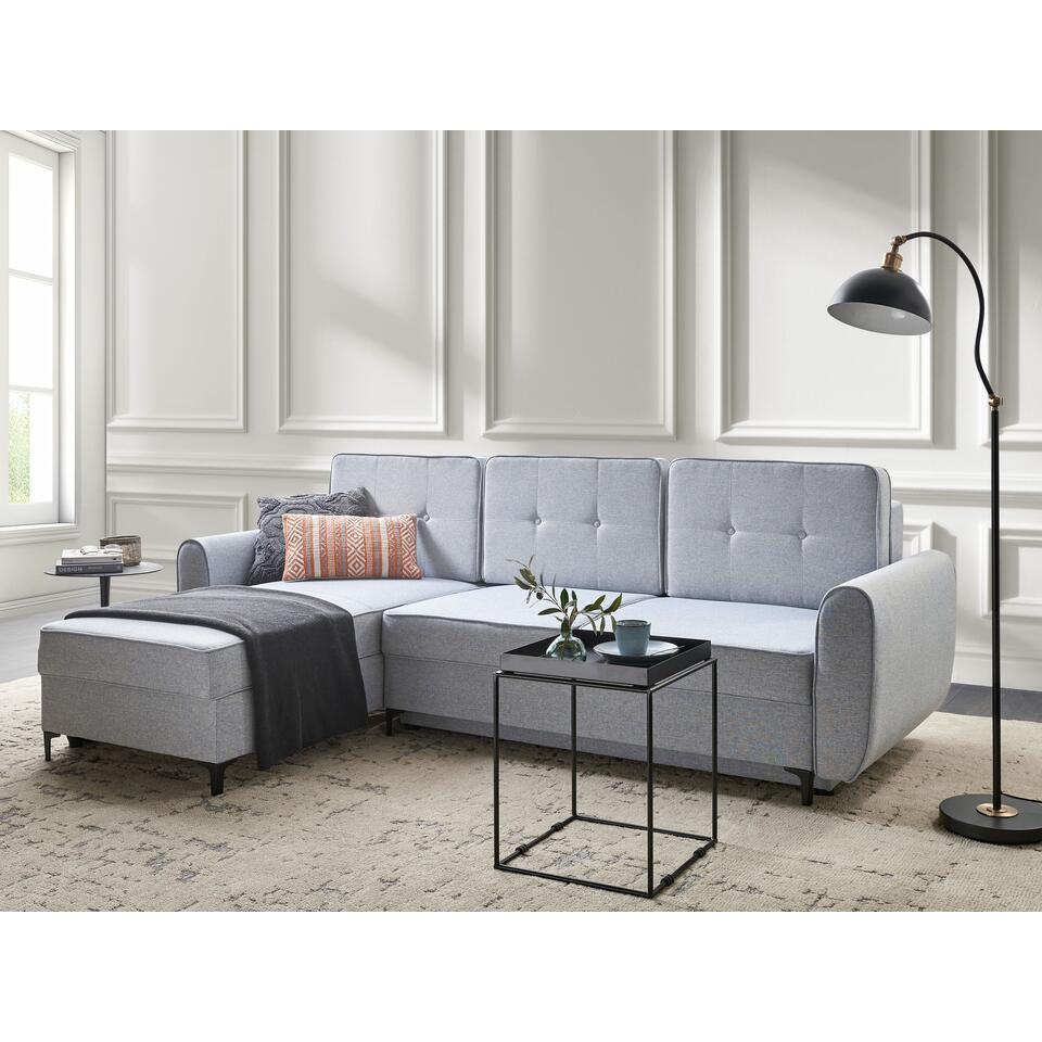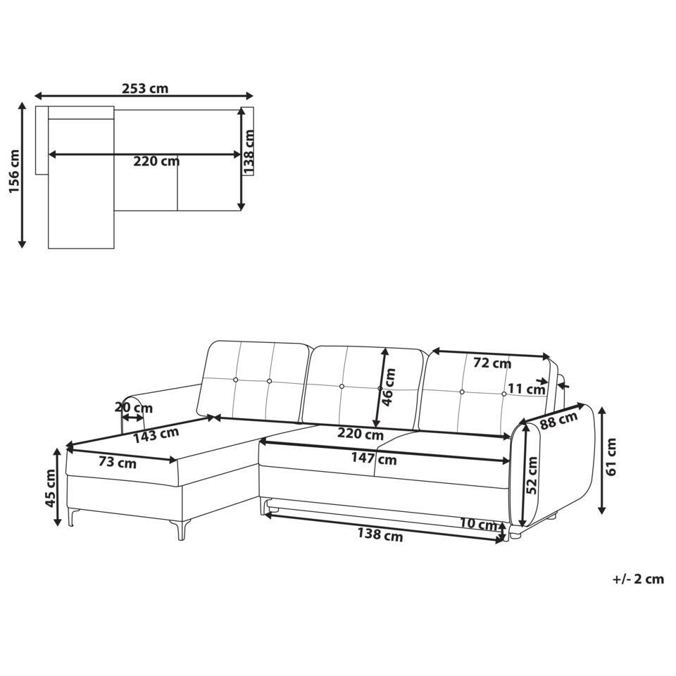 Gestoffeerde slaapbank met opbergruimte. Deze strakke hoekbank, bekleed met duurzame polyester stof, biedt een perfecte mix van stijl en functionaliteit. De bank is ontworpen met een ruim opbergvak en een slaapbankfunctie en kan gemakkelijk worden omgetoverd tot een comfortabele slaapplaats voor gasten. De strakke lijnen en getufte details zorgen voor een modern tintje, waardoor het een ideaal middelpunt is voor moderne interieurs.