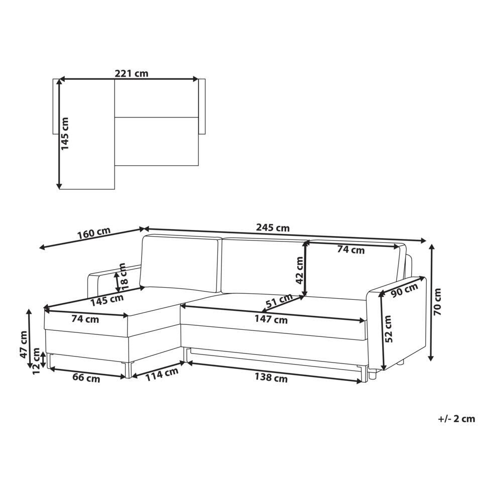Comfortabele hoekbank met opbergruimte. Deze elegante en veelzijdige bank brengt stijl en functionaliteit in je woonruimte. Hij is bekleed met polyester stof van hoge kwaliteit, heeft een handige slaapfunctie voor gasten die blijven slapen en verborgen opbergruimte onder de chaise en zitting. Ideaal om het comfort te maximaliseren en tegelijkertijd ruimte te besparen, dit meubel is de perfecte mix van vorm en functie. Dankzij de rijke, diepe kleur past hij bij verschillende moderne interieurstijlen.